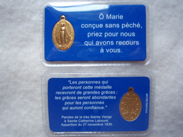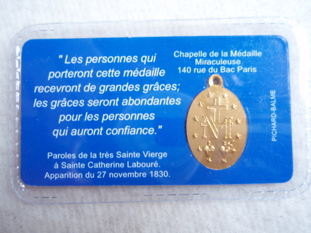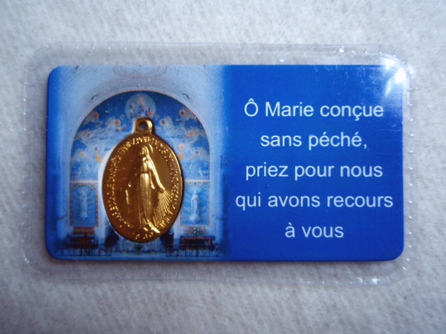 日本ではもちろん、今、フランス国内でもシャネルのデザイナー、カールラガーフェルドも付けている人気のメダイユです。パリの「奇跡のメダイ教会」の持ち運び用(財布の中や、バックの中等)のメダイユです。他にも透明のケースなしのメダイもございます。