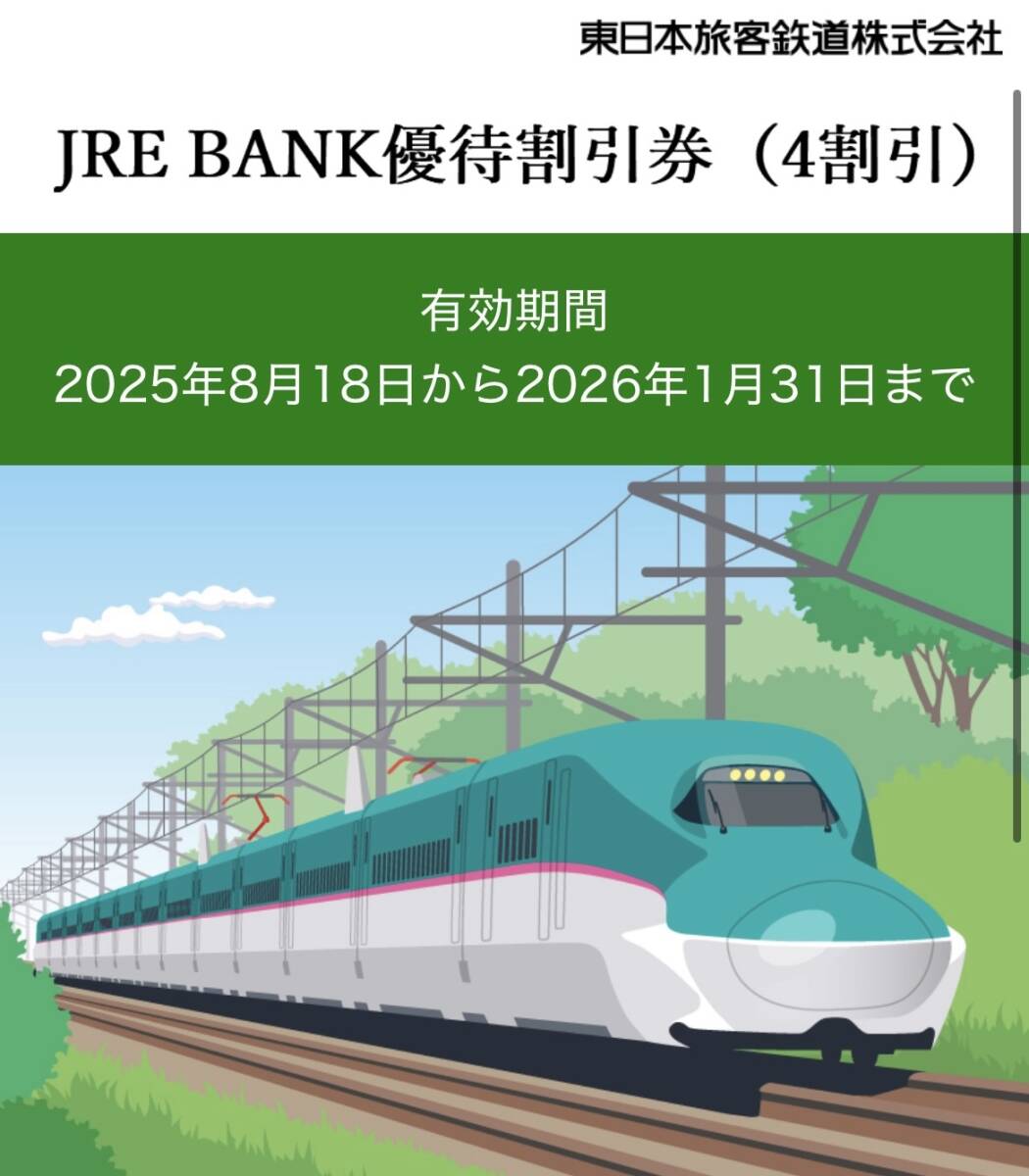 JRE BANK優待割引券です。4割引でJRを利用できます。有効期限は2026年1月31日までです。ご購入後できるだけ早くID・PWをお知らせします。