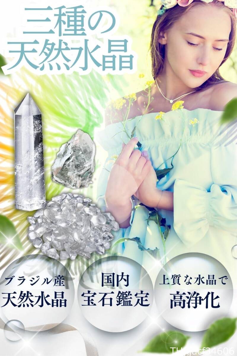 天然水晶の品質 本品に使用されている水晶は、ブラジル産の天然水晶です。透明度が高く、エネルギーを感じる美しい輝きが特徴です。宝石商による鑑定済みで、本物の品質をお約束します。