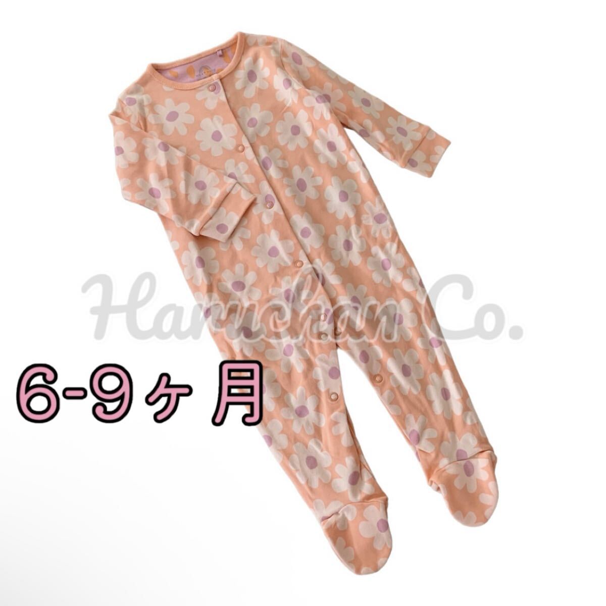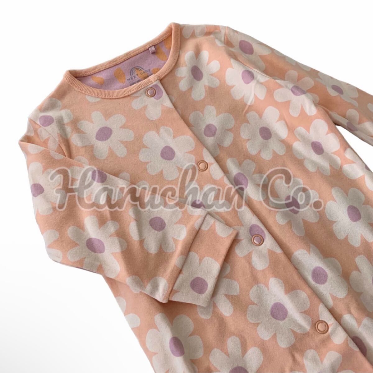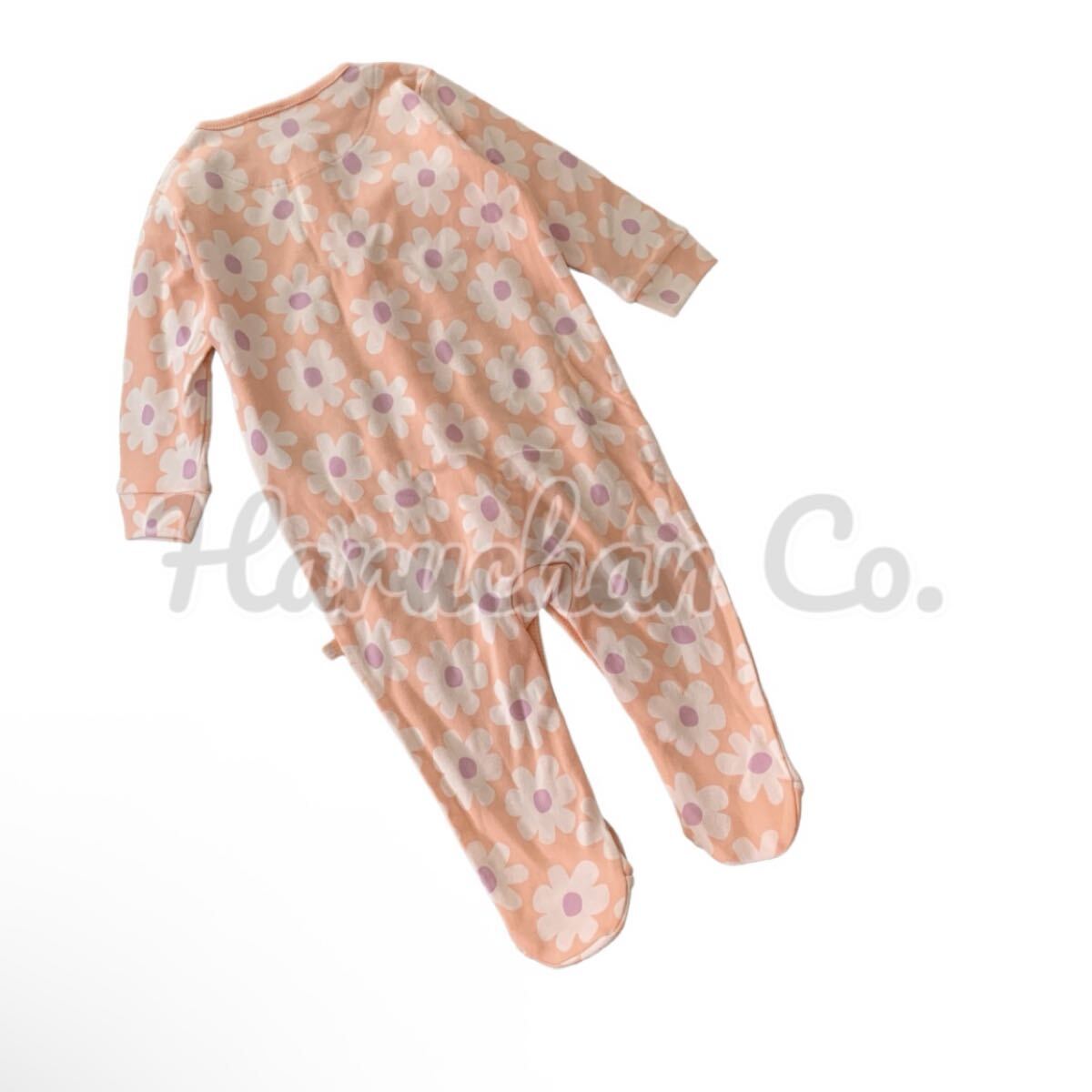 パステルオレンジにデイジー柄がかわいい前開きカバーオール