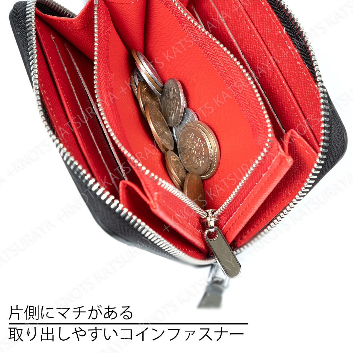 表面は独特な光沢で高級感があるカーボンレザーのミニ財布です。カードポケットが内側に4か所と外側にひとつあり、よく使うカードは外側に入れると便利です。マチのある小銭入れはL字に大きく開きます。