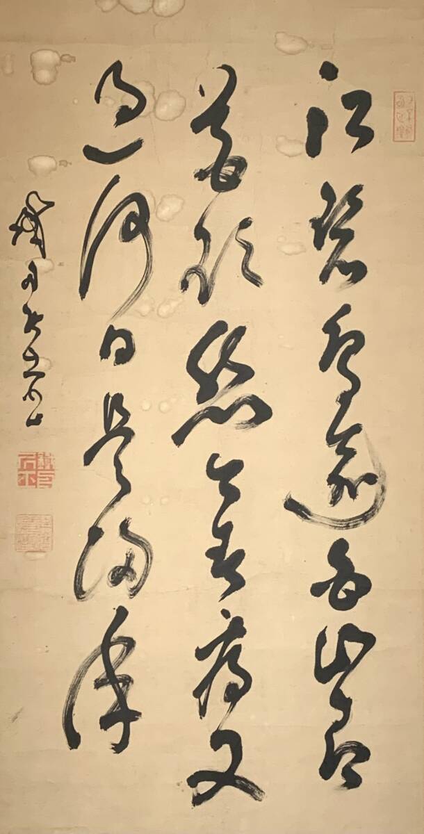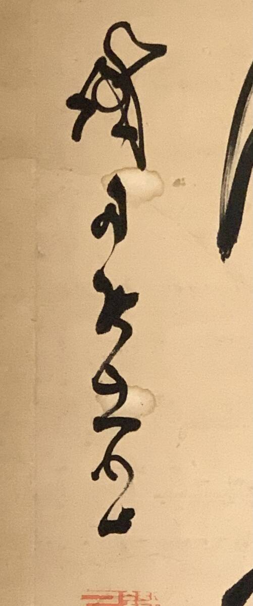 こちらの作品の状態ですが、  表具は年代によりだいぶくたびれており、上部には数カ所裏からの簡易補修、下部には破れ後がございます。