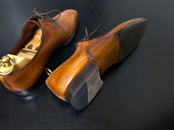 シャープなフォルムが特徴のアイテム。やや明るめのブラウンですので細かくはいくらかの汚れはあるののの特筆するダメージ、汚れはありません。アッパーの状態は良好かと思います。
