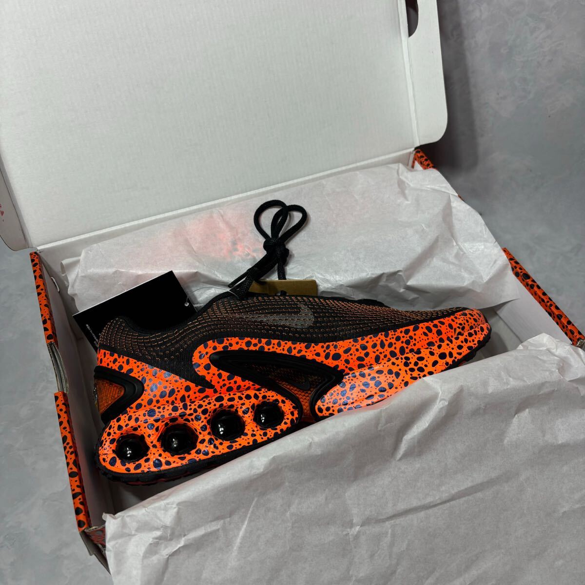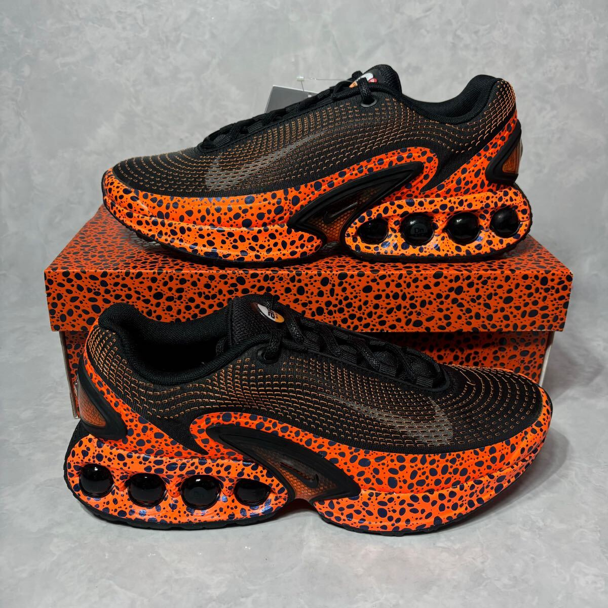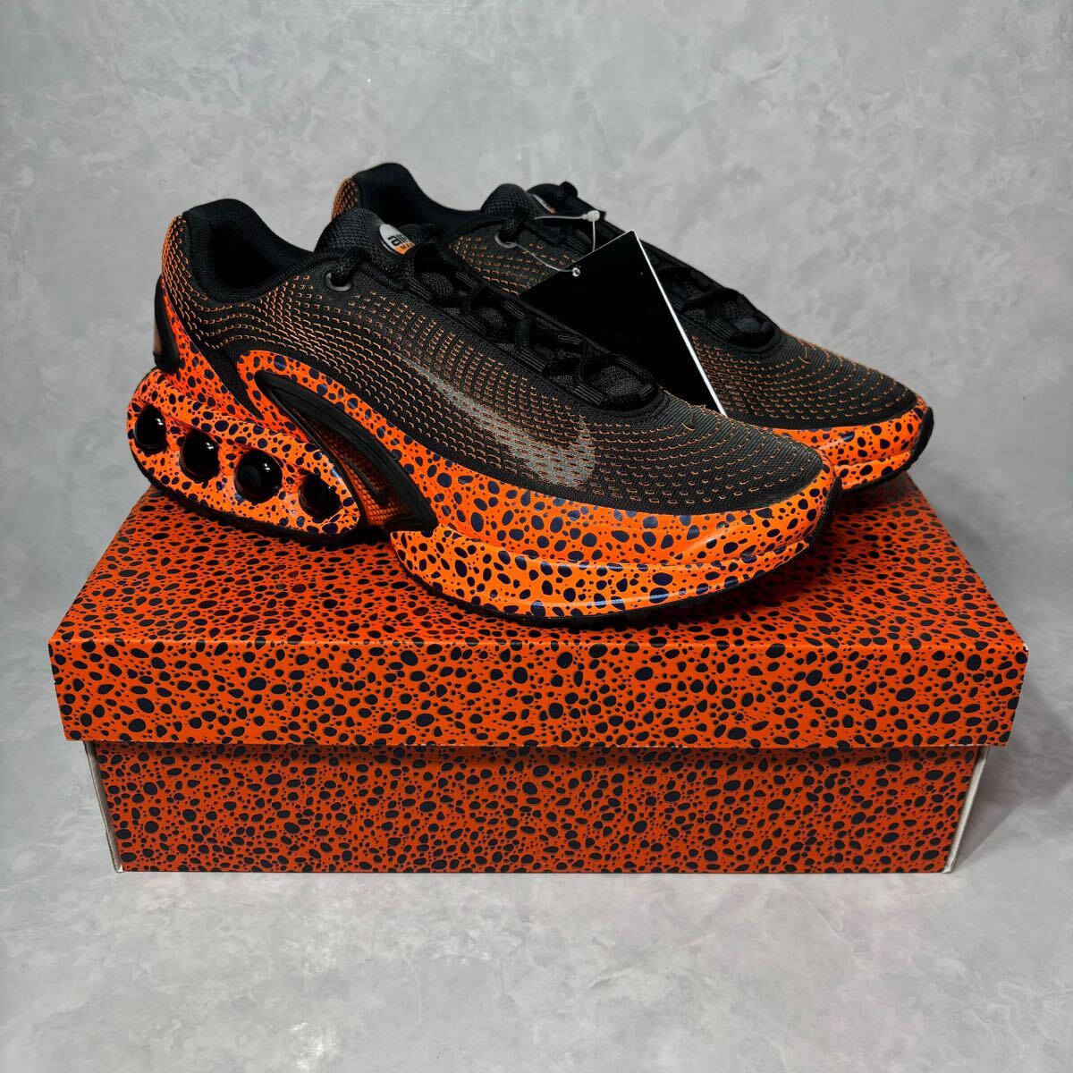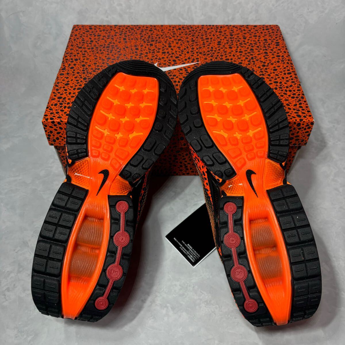 ブラック系のアッパーカラーに、オレンジのソールユニットを組みあわせ、サファリプリントを採用。