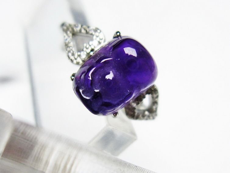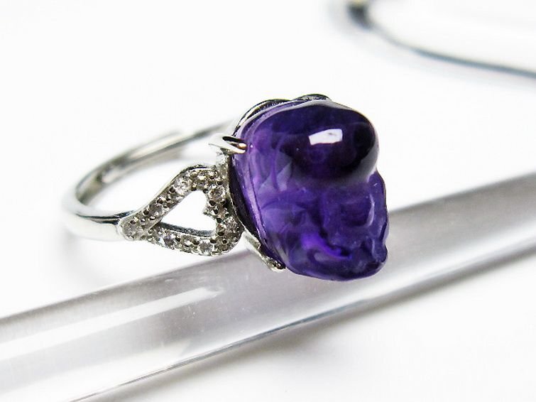 ■商品名: アメジスト ヒキュウ 指輪 ■商品ID: T275-22044 ■商品重量:約 2.5g ■商品サイズ:サイズ:15号 【アメジストクォーツ(紫水晶)】 アメジストは鉄分によって紫色に発色した水晶の一種です。 名称はギリシャ語で酒の意味のmethyと否定辞のa、つまり「酒に酔わない」「この石でできた盃で酒を飲めば悪酔いしない」に由来するとされています。 「酒に酔わない」と言われる通り、アメジストは体調面への作用が大きく、血液を浄化して解毒、解熱作用を高め皮膚病の治療や不眠を解消するのにも用いられたと言われています。 アメジストは真実の愛を導く愛の守護石とも呼ばれ恋愛運UPの石としても広く知られています。 理想的な出会いをもたらす効果や持ち主に美や調和を与え、セクシーな魅力を引き出すとのことですので恋愛成就のお守りとしても最適といえるでしょう。 また、くよくよしたり傷ついたりしている時には癒し、目前の困難を乗り越えていけるように精神を強くするヒーリング効果も期待できます。 不眠にも効果があるとされていますので、ストレスを抱えている人にもおすすめの石です。 ⇒ アメジストをもっと詳しく ◆ワンポイント情報 アメジストは産地によって結晶や色味の傾向が変わります。 例えばブラジル産は結晶が大きめだが色味は少し薄め、ウルグアイ産は結晶は小さく細かいが色味は濃紫の傾向、メキシコ産は細長い結晶でライラックの様な明るく透明感のある紫など特徴が異なります。 産地による好みが人によって分かれるのもアメジストならではと言えるでしょう。 |