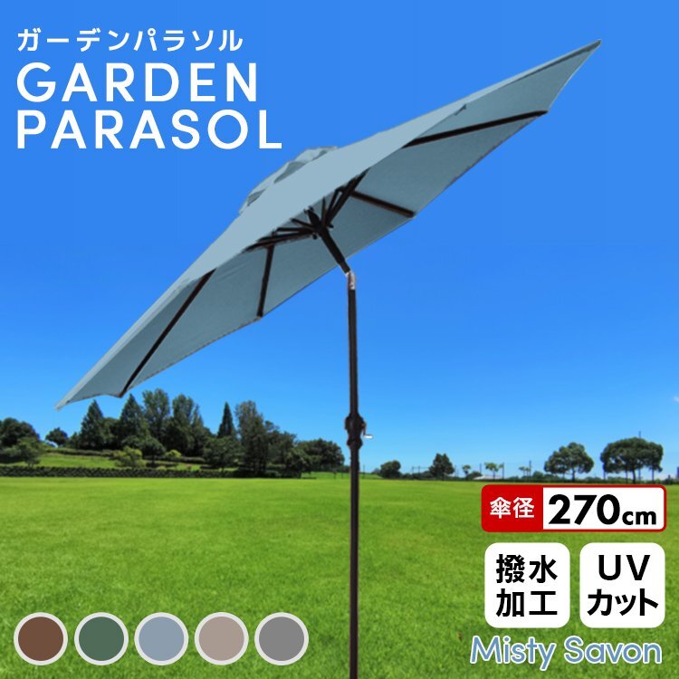 バーベキューにピクニックにビアガーデンと晴れた日には欠かせないアイテム! 日差しの向きにあわせて傘の角度調整ができる便利なガーデンパラソルです。 パラソルの開閉には、普通の傘とは違いハンドル式を採用。 ハンドルをクルクルと回すだけで開閉できるので、これほど大きなパラソルでも女性一人で簡単に開閉できます。 UVカットが施された270cmという大きなパラソルが強い日差しから守ってくれるので、 直射日光を気にせず快適にガーデンライフを楽しんでいただけます! アルミ製支柱なので木製パラソルと比較して軽量! ご自宅のお庭、バルコニー、テラスや店舗先のカフェペースなどにお使いいただけます。 河原でのバーベキュー、夏場にお子様のプール遊びの時にご使用になっているお客様もいらっしゃいますよ 【商品仕様】 ・カラー:ミスティサボン ・サイズ:(約)φ270cm×H240cm ※ポールの直径:(約)3.8cm ・収納時サイズ:(約)140cm×25cm ・重量:(約)4.6kg ・素材:ポリエステル、スチール、アルミ他 ※パラソルベースは別途ご用意ください※ 【注意事項】 ・傘生地には撥水加工をしておりますが、完全防水ではありません。 ・風や雨が強い日の使用は危険ですので、ご使用しないでください。 パラソルやベースを地面に固定しても突風や瞬間的な豪雨などでパラソルが破損する場合がございます。 そのような自然現象による破損につきましては保証の対象外となりますのでご注意ください。 ・商品は、モニターによって色合いが異なって見える場合があります。 ・仕様・デザインは改良のため予告なく変更することがあります。 |
