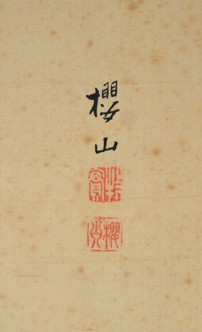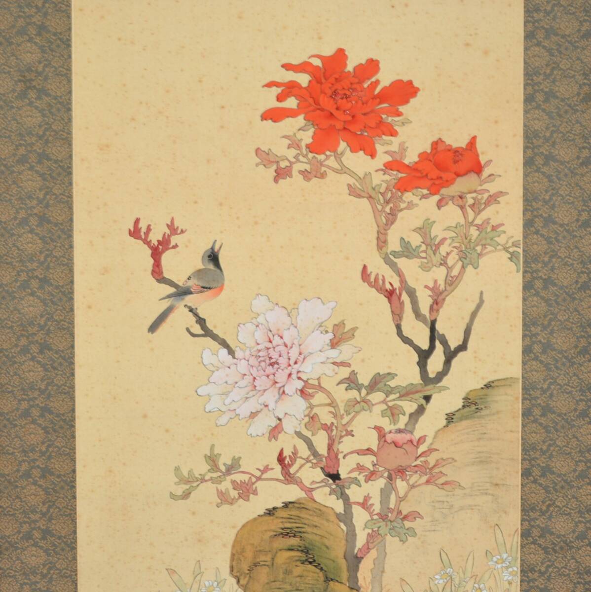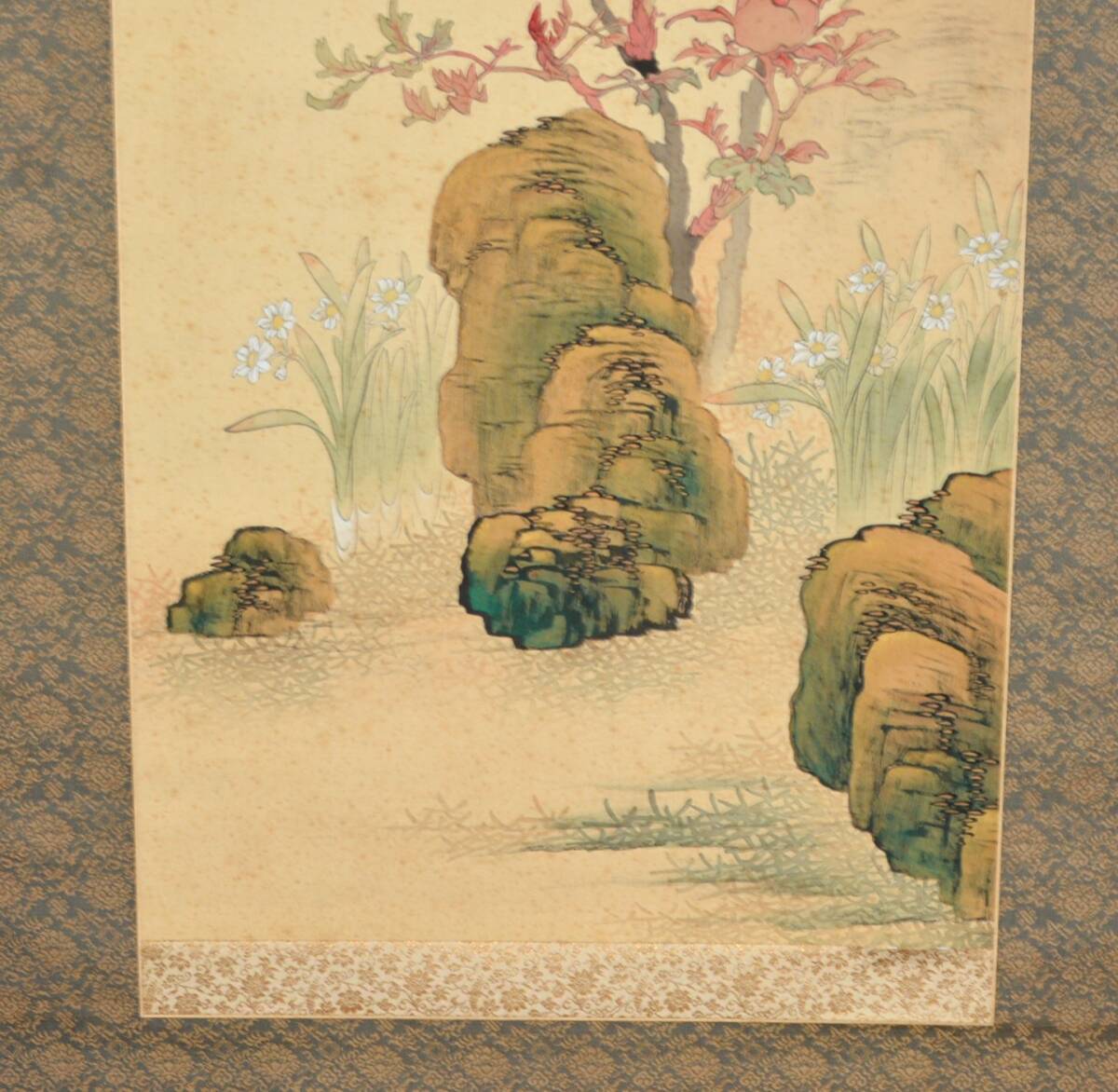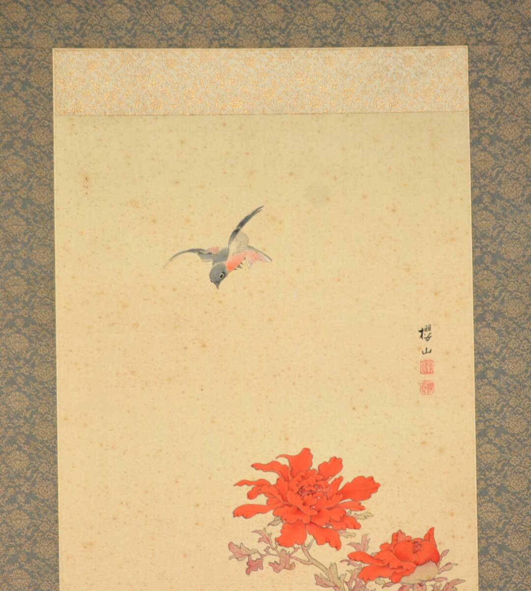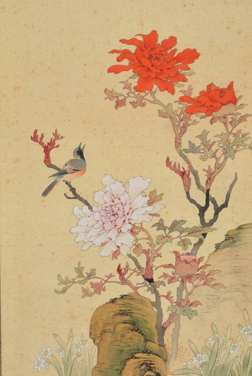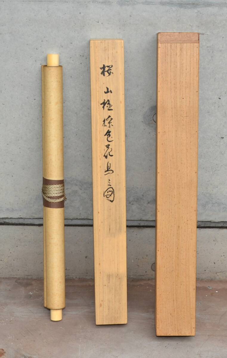 22◆初荷です ◆掛軸 牧櫻山 極彩色花鳥之図 真作 絹本 ◆二重箱 大正~昭和の画家