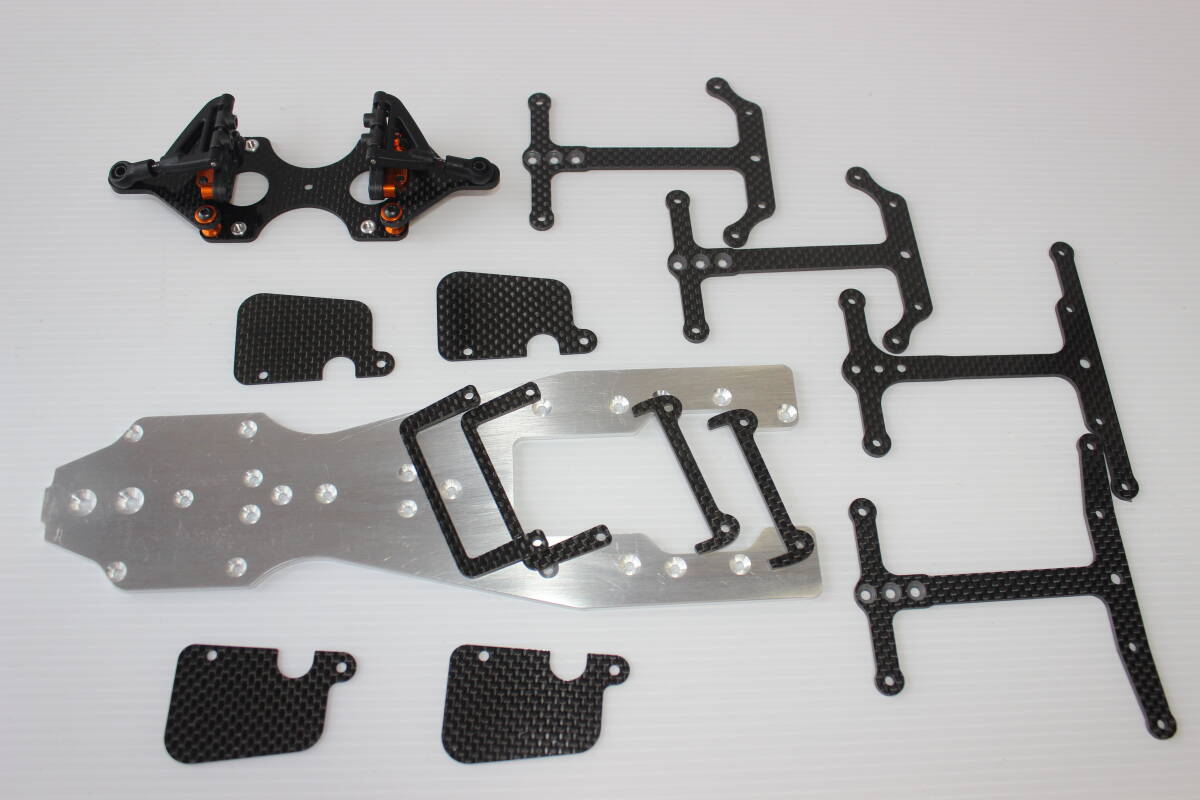 未使用のアルミシャーシー/XRAY仕様のFサスペンション/他カーボンパーツ が付きます。