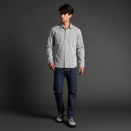 布帛の様なシアサッカ―をハイゲージニットで表現したシャツになります。主張し過ぎないサッカー効果、軽くてハリコシがある風合いはシャツアイテムに最適。ドライタッチな肌離れの良さでストレスフリーな着心地となっています。今季は衿端にワイヤーを仕込んだショートレギュラーカラーを採用しているのでスタイリングの幅が広がるアイテムに仕上げています。