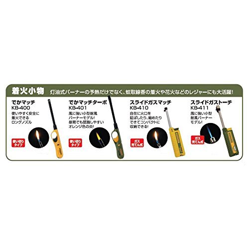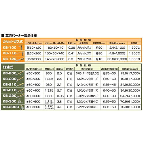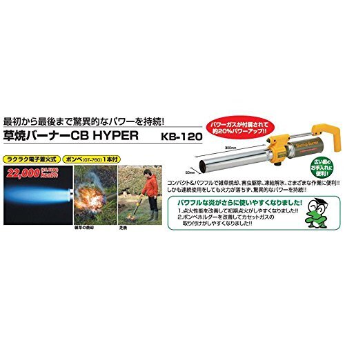 ・2)イエロー KB-120・・Color:2)イエローPatternName:2)本体+純正パワーガス1本・・産国:日本 炎温度:1 300℃ 点火方式:電子着火方式・ ・使用燃料:新富士バーナー製品専用容器(カセットガスタイプ) 付属品:カセットボンベ1本(GT-760)・ ・使用可能ボンベ:GT-700/GT-760・ ・寸法:高さ145×幅75×長さ680mm 重量:0.8kg(本体のみ) 火口径:直径50mm(外径) 炎サイズ:直径50×300mm・ ・燃焼時間:約10分(GT-760 1本使用時)発熱量:25.6kW(22 000kcal/h)(GT-700使用時)※ 5分間の燃焼データーを1時間に換算したものです。商品紹介・ <商品説明>ガーデニングを始め、乾燥、解氷、除草作業に・ ・ ●お届け時間の指定は承れません。ご了承ください。●製品本来の目的以外の用途には使用しないでください。●破損の原因となる行為、乱暴な取扱はしないでください。
