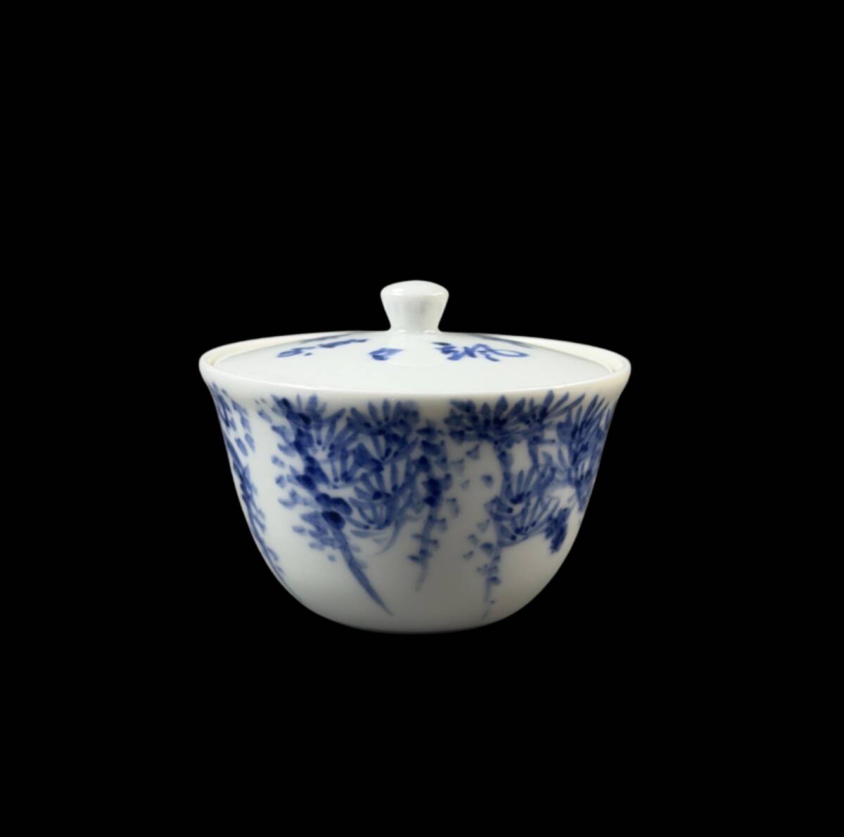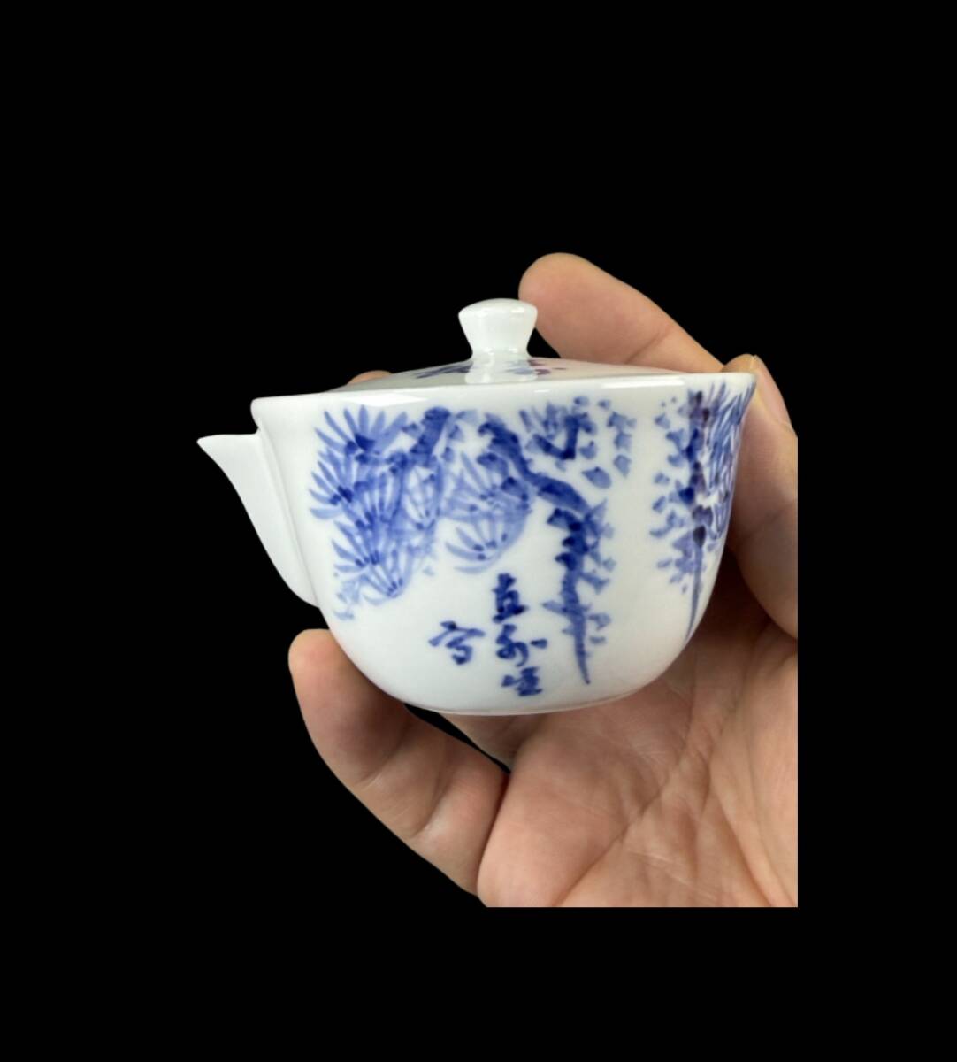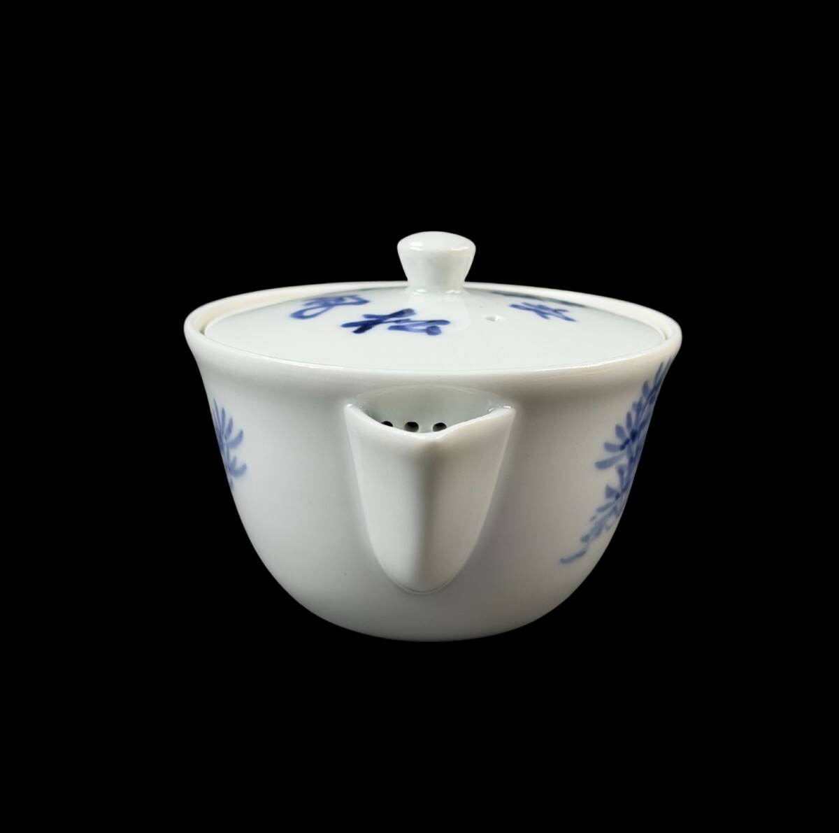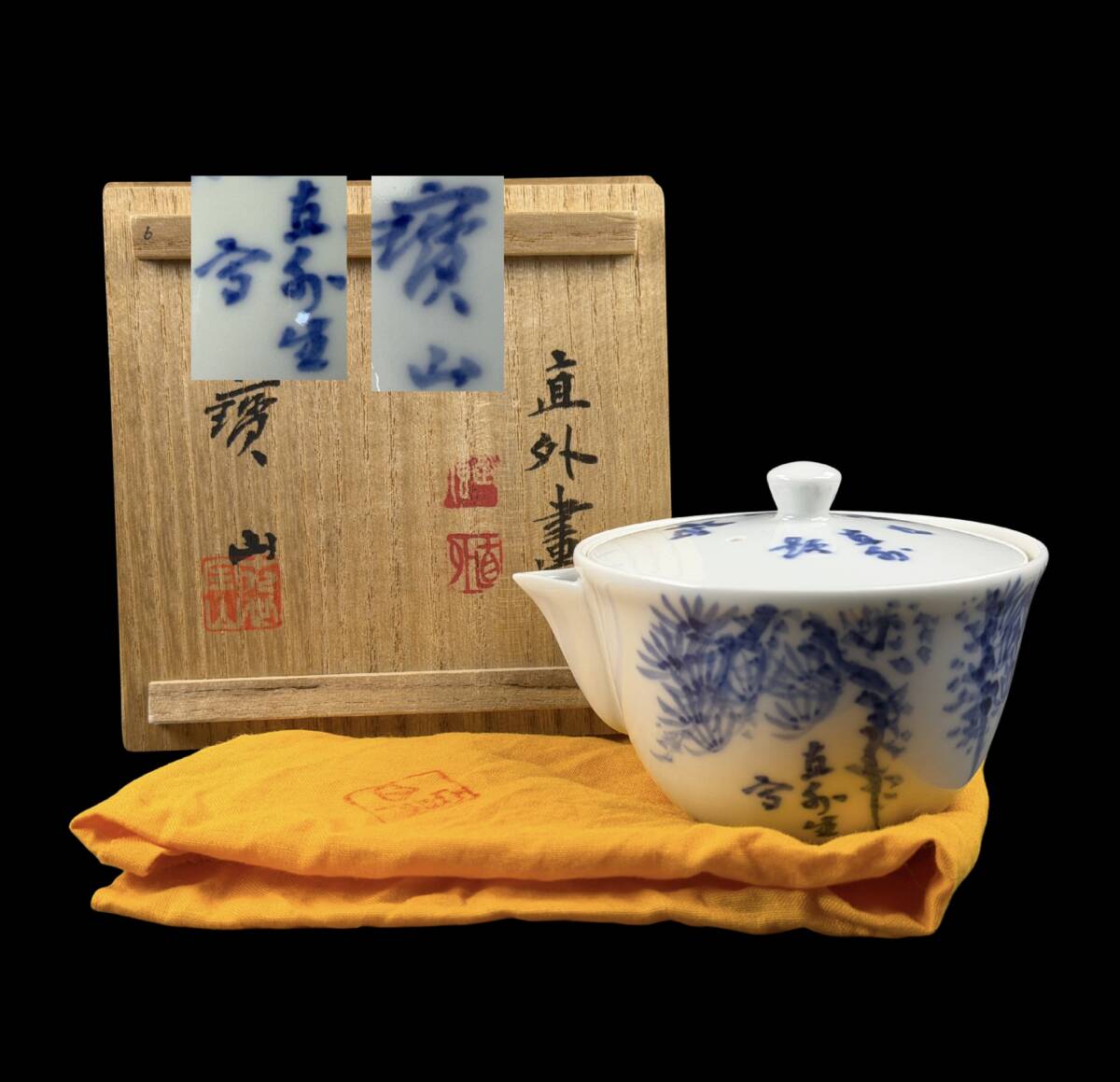 【偲】雲林院宝山 昌平寶山 造 泡瓶 宝瓶 直外翁御染筆 松図 染付 茶器揃 急須 共箱 共布 在銘 高さ約6.5㌢ m-53