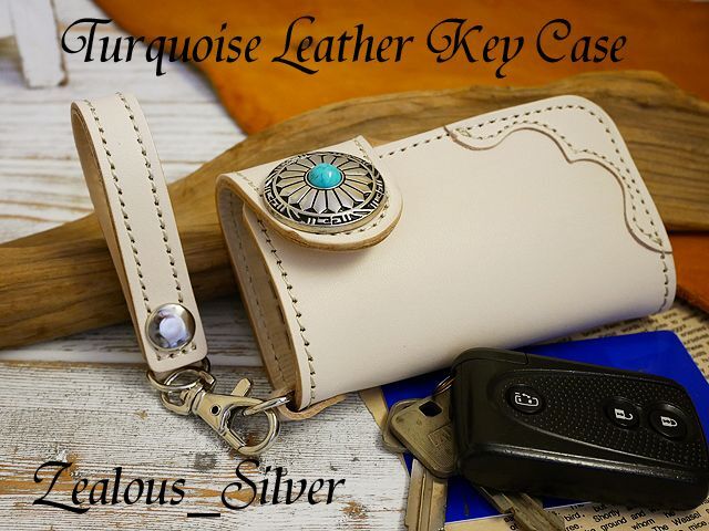 ターコイズ レザーキーケース キーホルダー付き スマートキー カードポケット付き ハンドメイド 姫路レザー