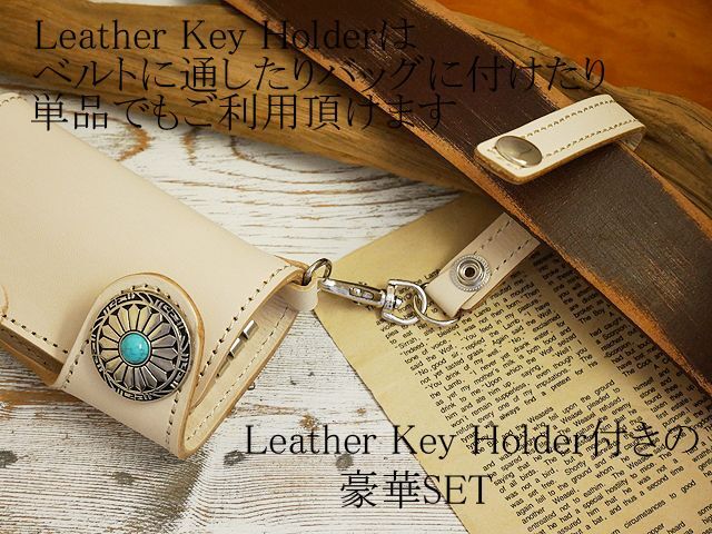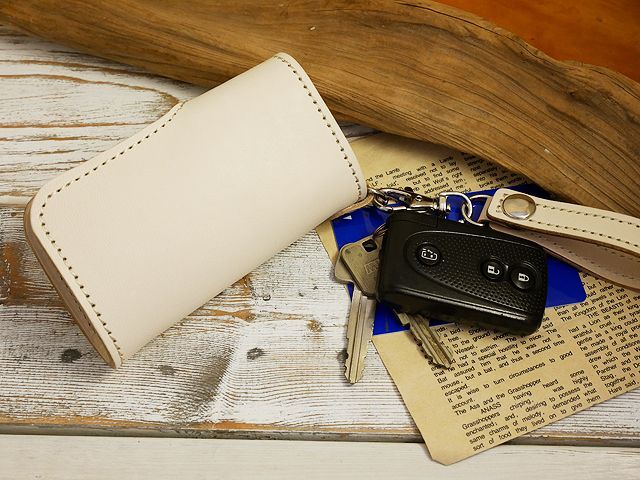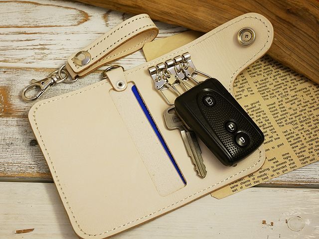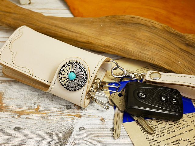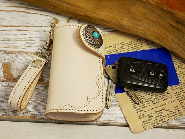 ターコイズ レザーキーケース牛ヌメ革 キーホルダー付き スマートキー カードポケット付き タンロー(ナチュラル)
