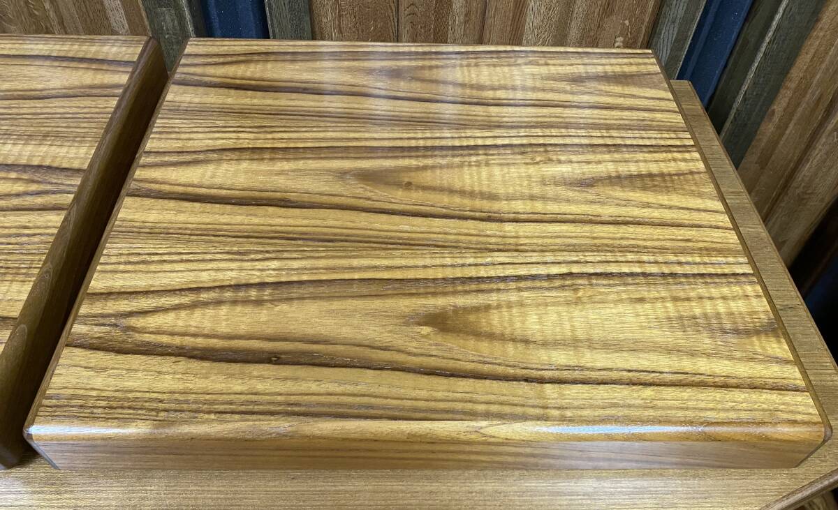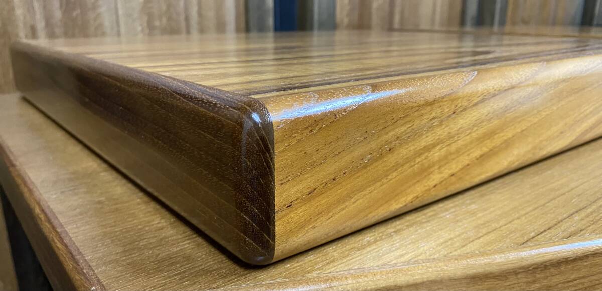 チーク突板とラワン合板を油圧プレスにて圧着、2面プレーナーにて均したスプルース集成材を油圧プレスにて横ハギし、その後にチーク突板×ラワン合板を貼り合わせ油圧プレスにて4日ほど接着しております。