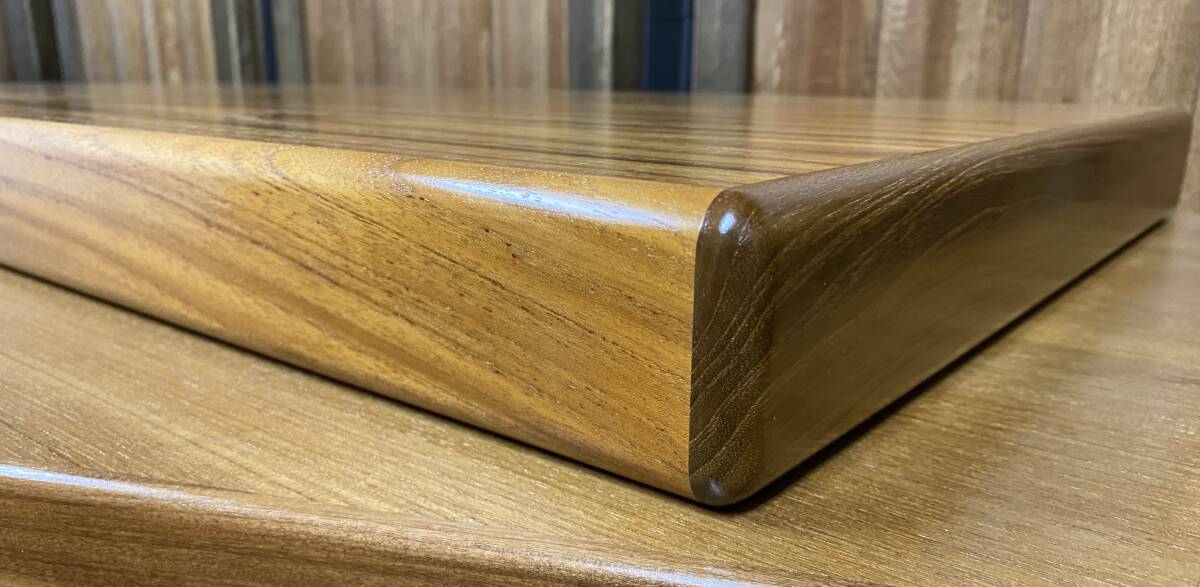 チーク突板は表裏合わせて4枚、ラワン合板が2枚、スプルース集成材が2枚の計8層構造となっております。