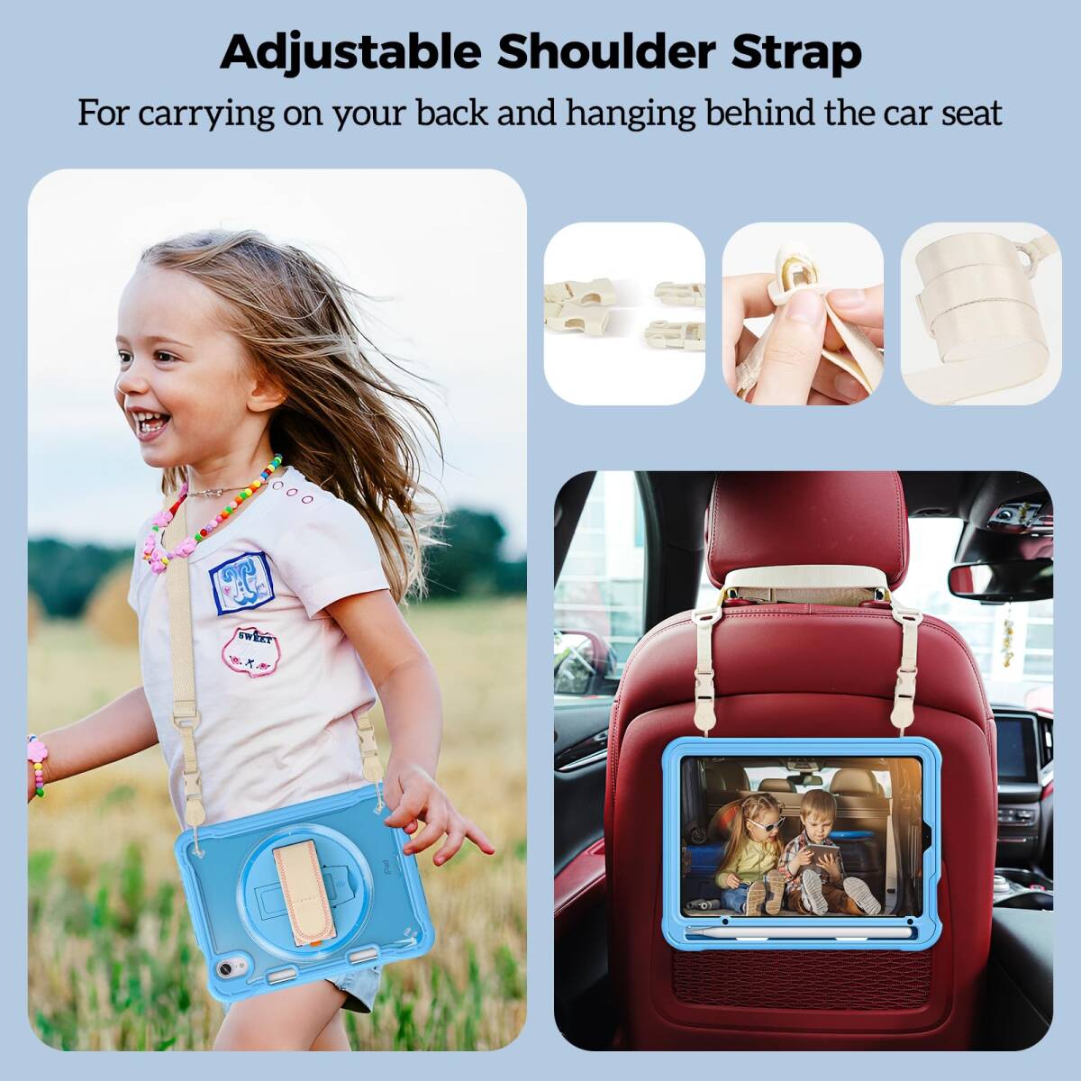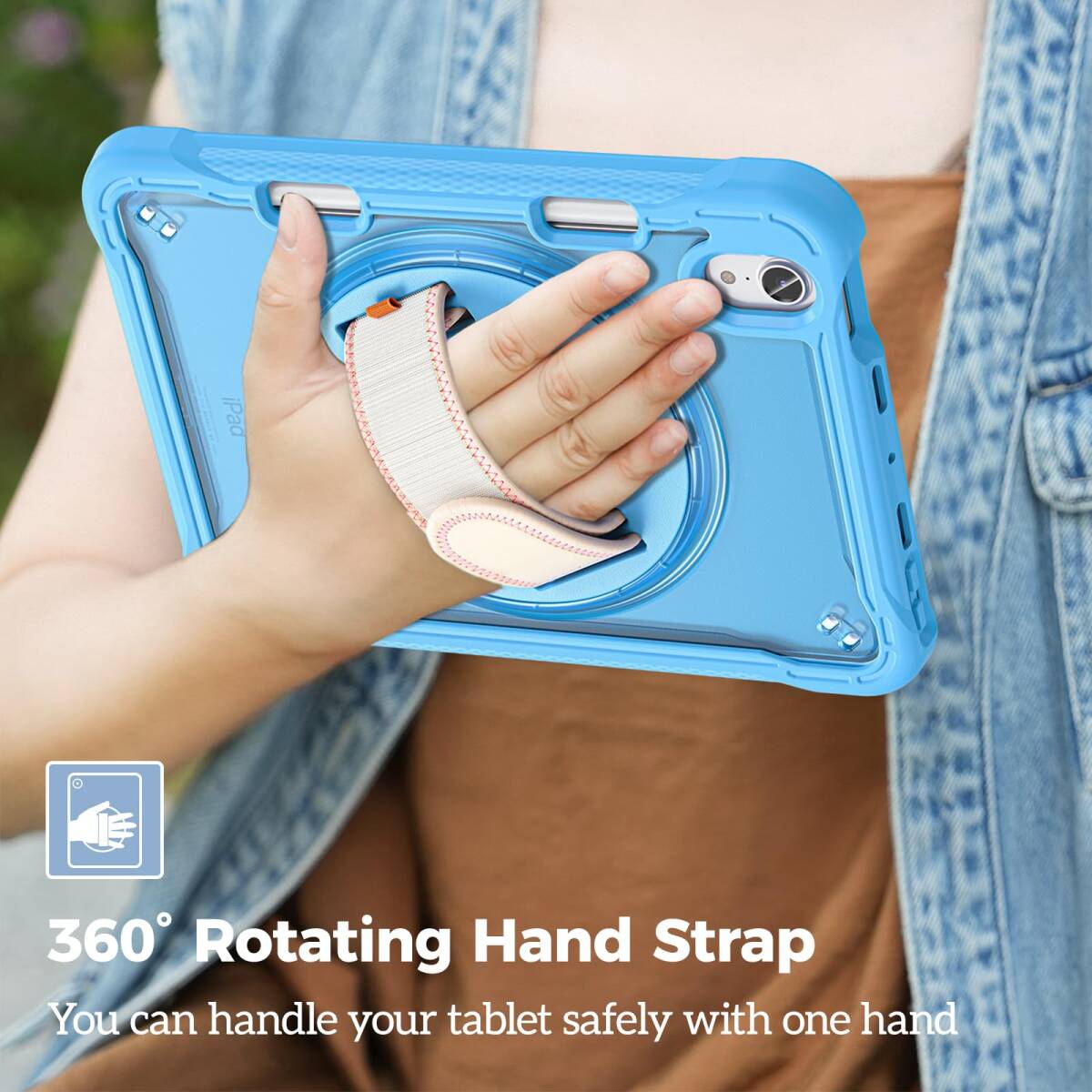 ProCase iPad Mini A17 Pro 第7世代 2024 Mini6 2021 8.3インチ 肩掛け式 子供・現場作業用 耐衝撃 カバー ペン収納 360°回転スタンド ハンドストラップ付き 適用機種:iPad Mini A17 Pro 第7世代 2024、Mini 第6世代 2021 - ブルー