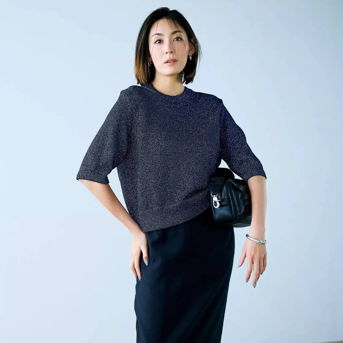 基本はシンプルでありながら、ラメ糸の輝きやほどよいクロップト丈、少し長めの五分袖が鮮度の高いスタイルを約束。キラキラ具合がちょうどよく、大人が着こなしやすい。