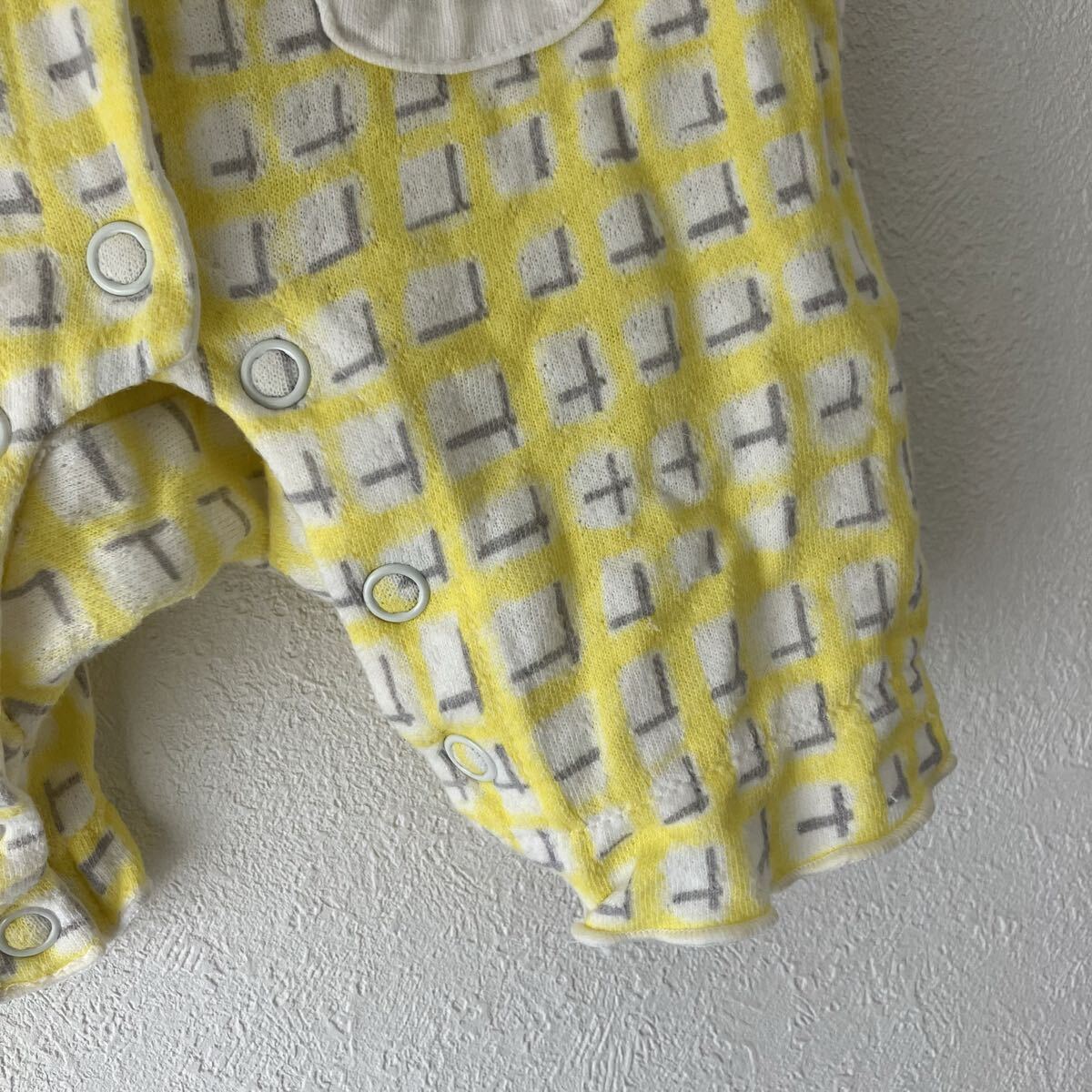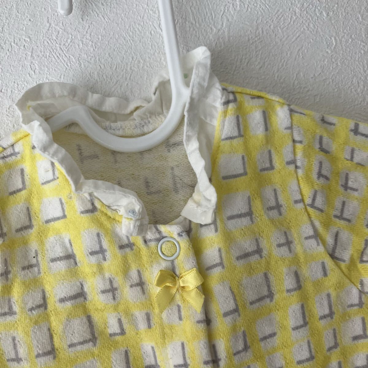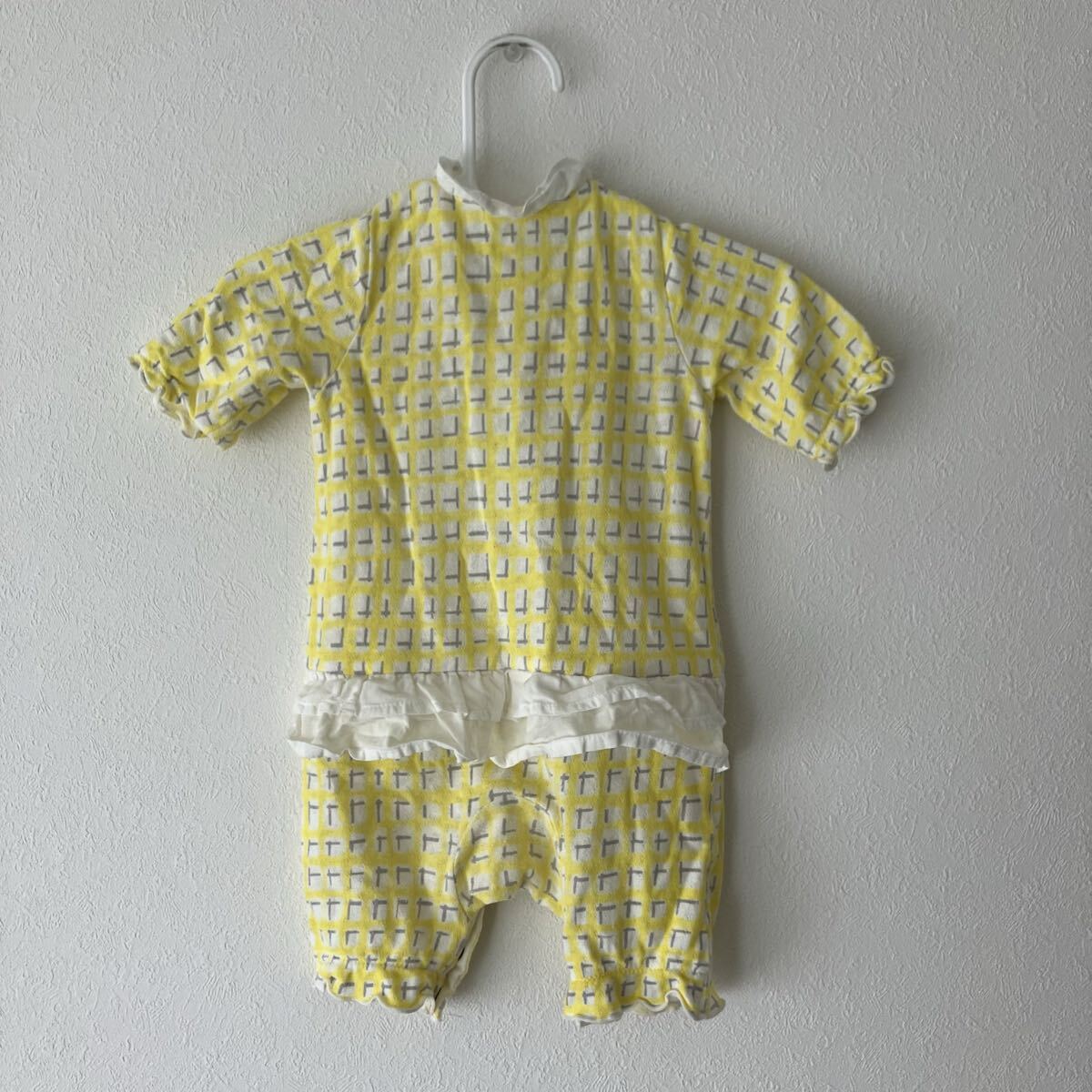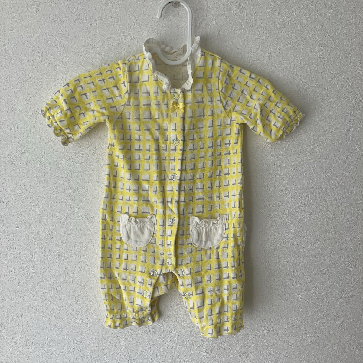 イエローとグレーのチェック風の柄のロンパース、フリル付きの襟とリボン装飾が特徴です。