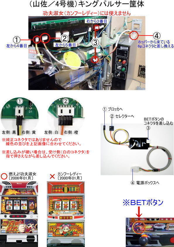 使用方法 | 仕 様(オートBET〔自動投入〕機能付) 電源投入直後はオートBET…〔OFF〕の状態です。 BETボタン…長押し(1秒)で50枚分を投入します。 クレジットが少なくなった状態で長押し(1秒)すると50枚分を投入します。 50以上の表示/貯玉はされません。 BETボタン…短押しでオートBET…〔ON〕になります。 コイン信号が自動投入されます。 オートBETを〔OFF〕にする。 BETボタン…短押しでオートBET…〔OFF〕になります。 リール停止中/回転中でも〔OFF〕になります。 短押しする度に、オートBET…〔ON〕 → 〔OFF〕 → 〔ON〕 → 〔OFF〕 と切り替わります。 ★ブロッカ〔2p〕とセレクター〔5p〕は純正コネクタではありませんので 説明画像の色の並びで差し込んでください。 |