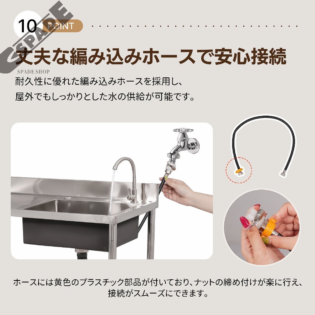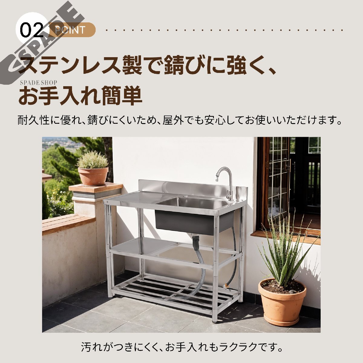 • ◎01【清潔で快適な屋外作業に】サビに強いステンレス製の屋外シンクです。ガーデニングやBBQの準備、ペットの足洗いなど、屋外でのちょっとした洗い物にとても便利です。丈夫でサビにくい素材を使用しており、雨ざらしの場所でも安心して長くご使用いただけます。シンプルで使いやすいデザインで、毎日の暮らしをより快適にサポートします。