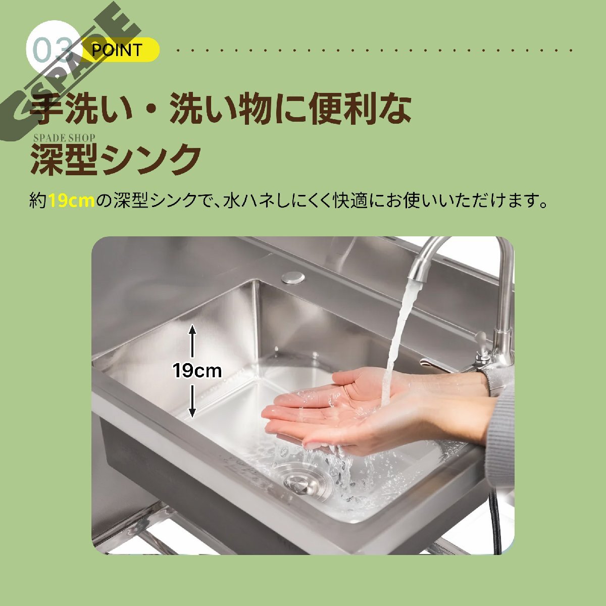 • ◎04【手洗い・洗い物に便利な深型シンク】約19cmの深型シンクで、水ハネしにくく快適にお使いいただけます。【便利な作業台付きで、さらに使いやすく】野菜や果物を切ったり、小物を置いたりと、ちょっとした作業に便利なスペースを備えています。