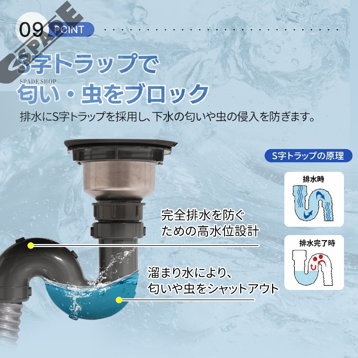 • ◎06【匂いやサビが発生しにくい設計】汚れに強く、匂いが残りにくい構造で、清潔にお使いいただけます。(防水シーりングカバー)(ごみ受けカゴ)(ステンレスカップ本体)(上部ゴムリング)(下部ゴムリング)(ABSプラスチックナット)【S字トラップで匂い・虫をブロック】排水にS字トラップを採用し、下水の匂いや虫の侵入を防ぎます。