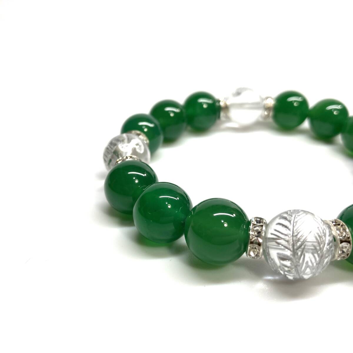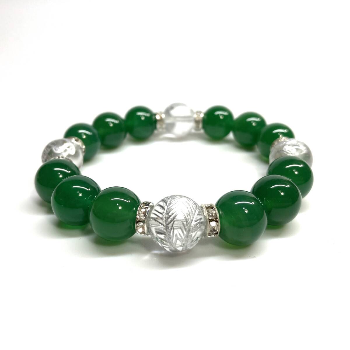 こちらは、四神獣銀彫水晶と緑瑪瑙を組み合わせたパワーストーンブレスレットです。四神獣は、中国の伝説で4つの方向(東西南北)を守護する神聖な神。四神獣、厄災から身を守り、多くの運気を呼び込むと言われております。石大きさは程よくインパクトのある12mm玉で内周 約17cmです。 数に限りがございますので気になる方はお早めにどうぞ。