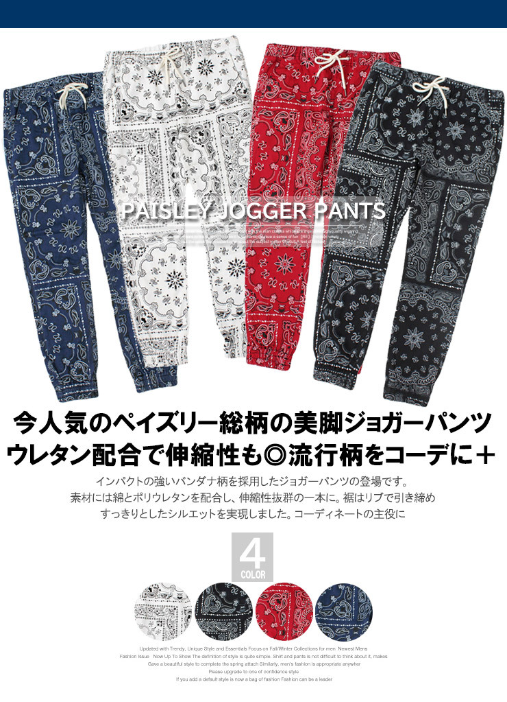 | 商品説明 | インパクトの強いバンダナ柄を採用したジョガーパンツの登場です。 |