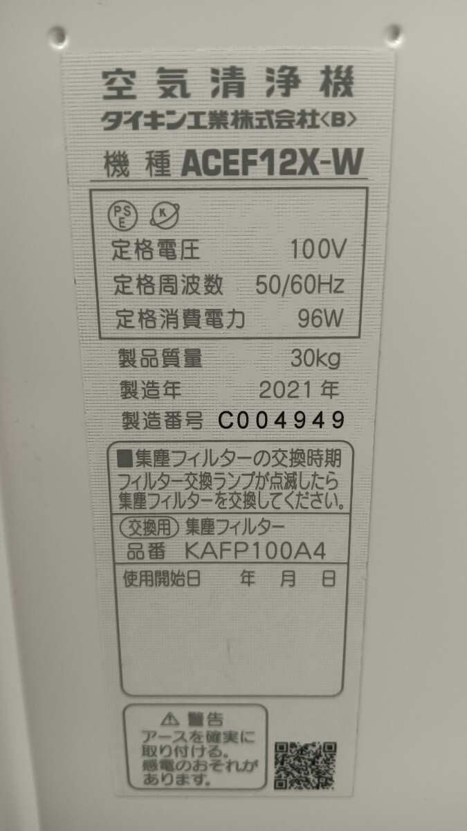 商品名 :【※引き取り限定】 空気清浄機/ダイキン工業株式会社/ACEF12X-W/2021年製/ DAIKIN