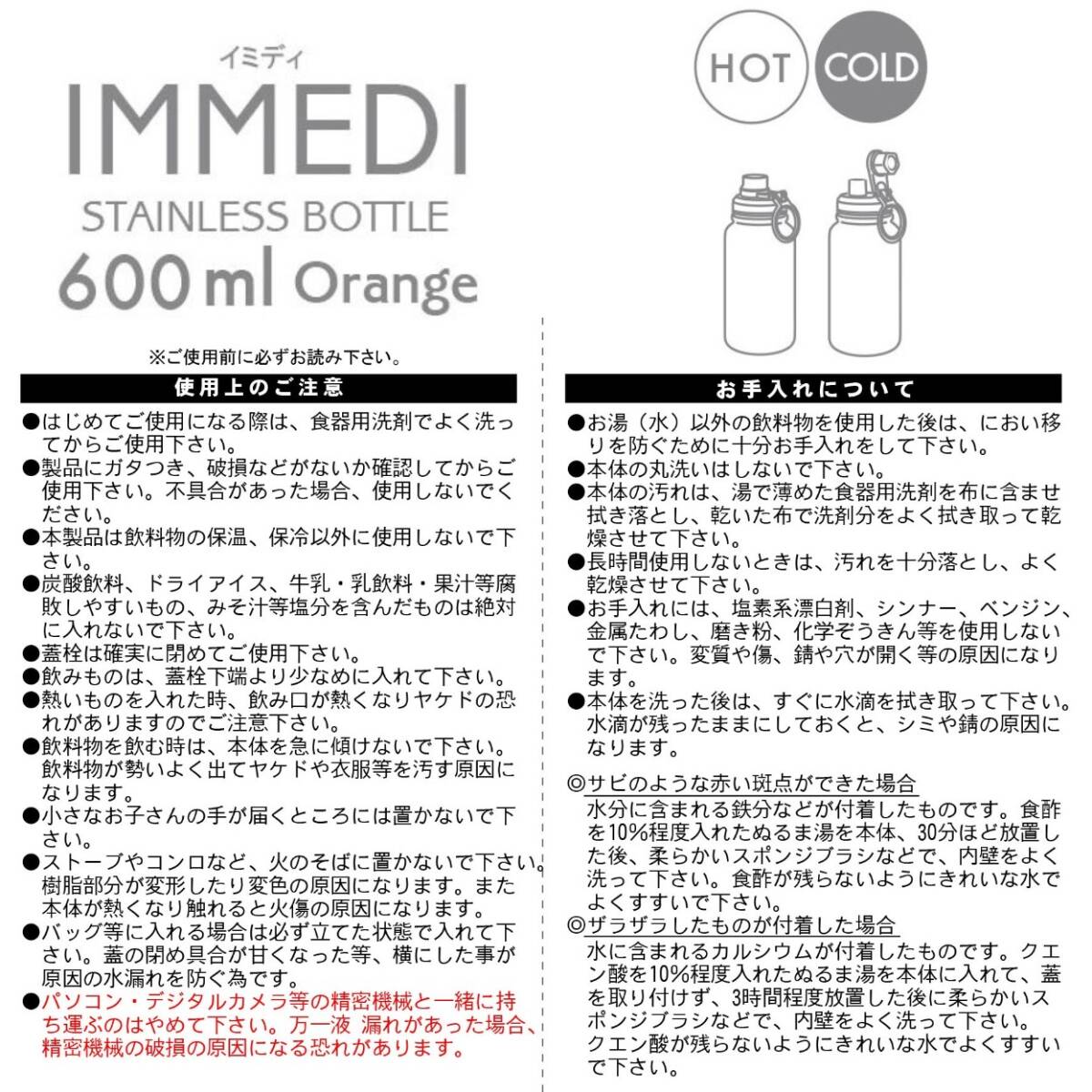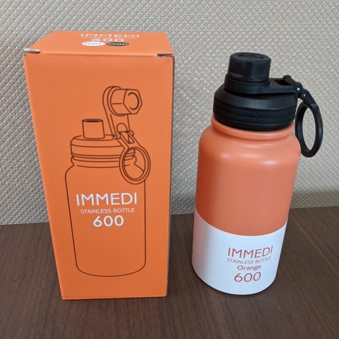 ステンレスボトル 600ml 保冷 保温 IMMEDI BOTTLE オレンジ 氷が入れやすい 洗いやすい 広口 直飲み 滑りにくい ボトル