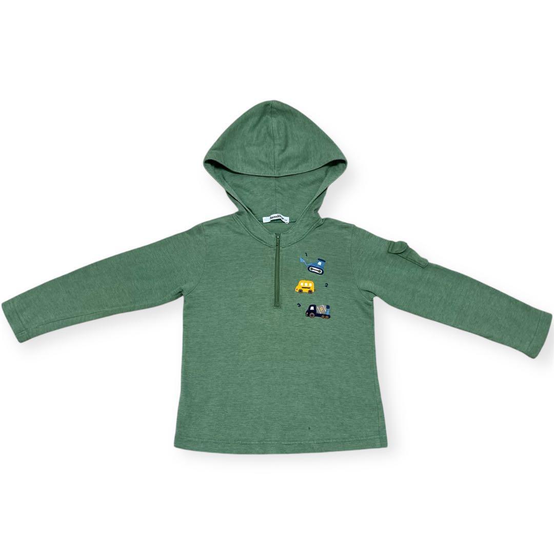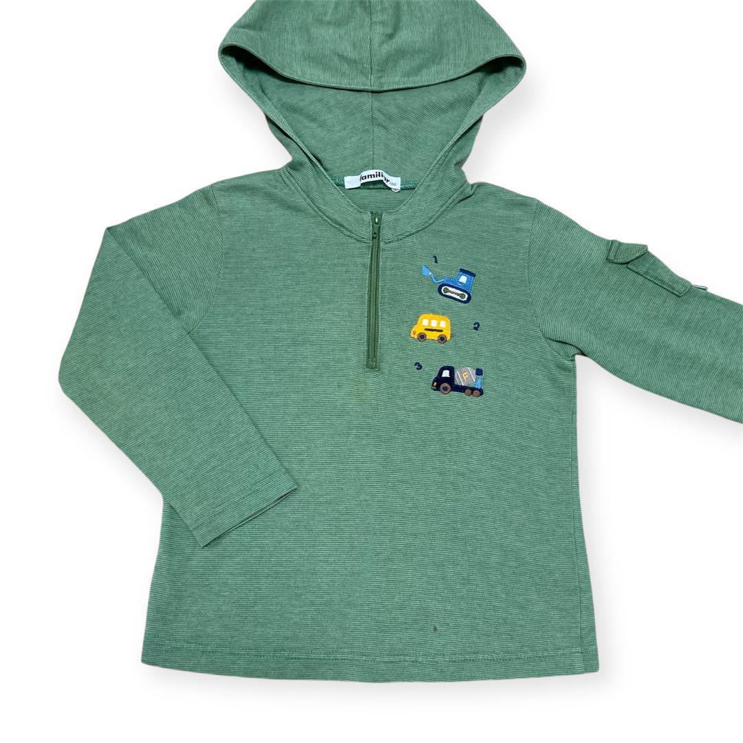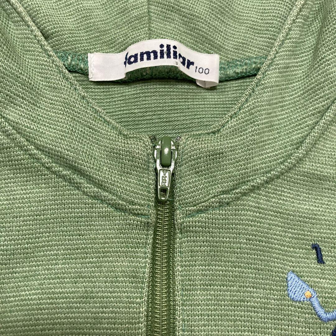 familiarのとても可愛いパーカーです。ショベルカーなどの乗り物や車のワッペンが付いています。腕にもワンポイントとfamiliarと書いてあるボタンが付いています。