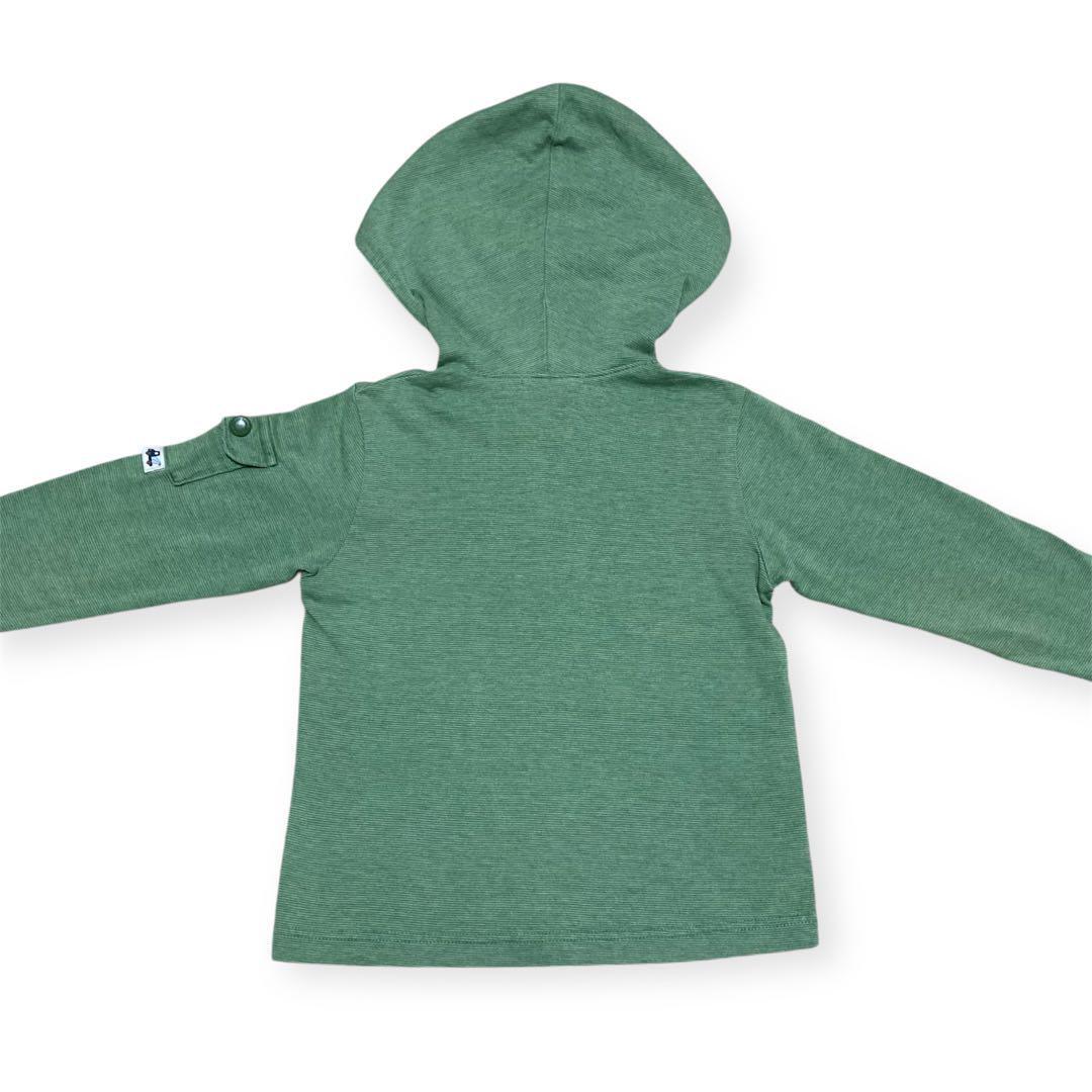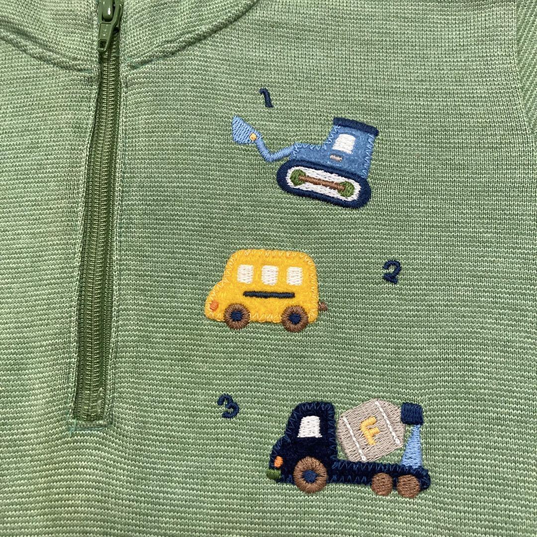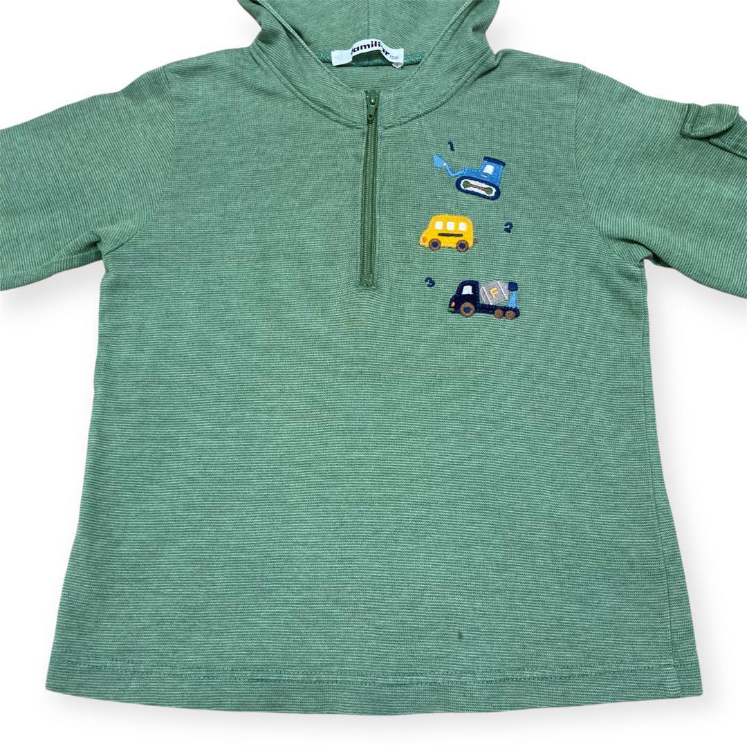 familiarのとても可愛いパーカーです。ショベルカーなどの乗り物や車のワッペンが付いています。腕にもワンポイントとfamiliarと書いてあるボタンが付いています。