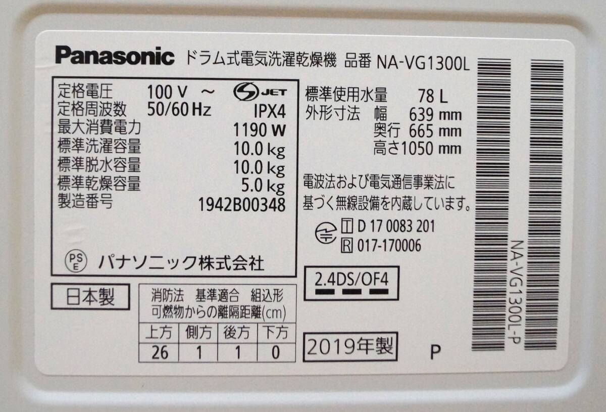 【パナソニック】Panasonic NA-VG1300L-P ななめドラム洗濯乾燥機 左開き 洗濯10kg 乾燥5kg 2019年 (D21)