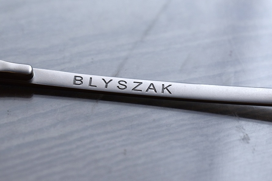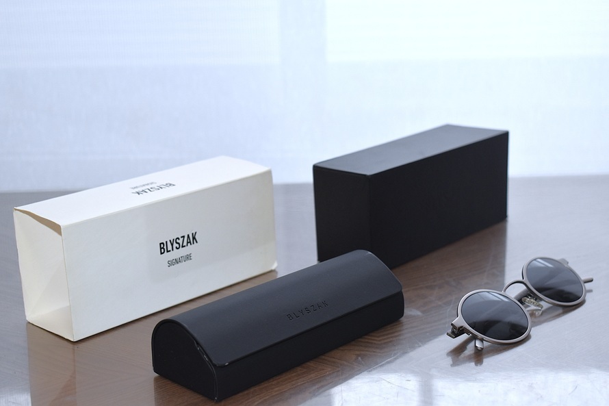 素材はスチールなど、素人採寸ですがレンズサイズは約H3.5×W4.5(最長部計測/フレーム含まず)、正面フレームサイズ約12、テンプルサイズは全長約14、一部付属品なし、専用ケース付未使用、購入時の定価3万3000円(表示なし https://blyszak.com/collections/all/products/signature-brushedsilver-blacklens 公式オンライン参照)です。
