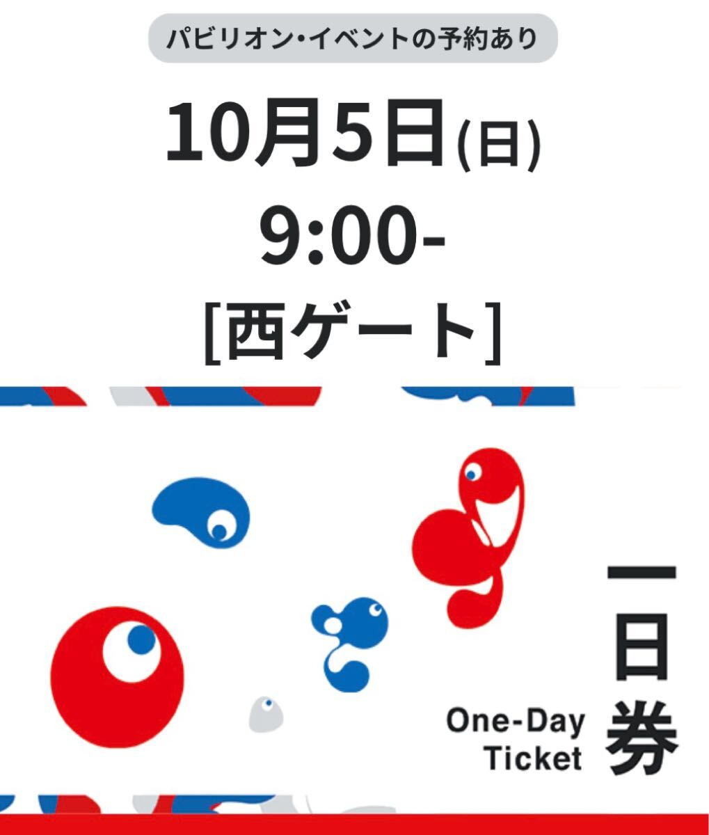 2025大阪・関西万博の10月5日(日)西ゲート9時入場の予約済みチケット(大人一日券)1枚です。