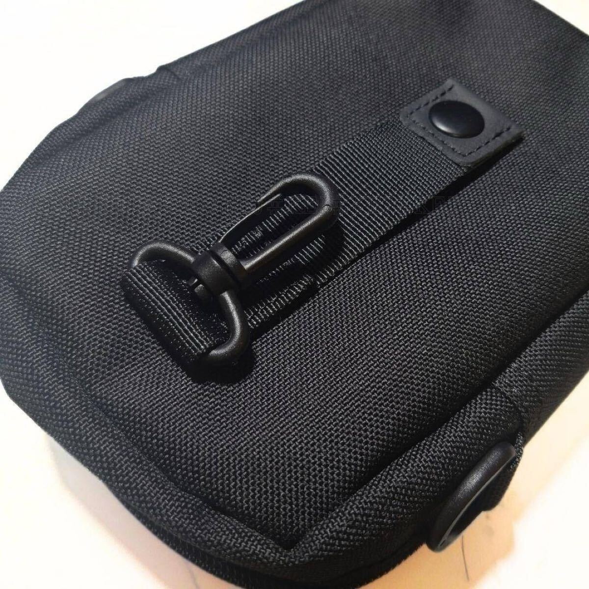 裏側にはカラビナ・ベルトループを備えています。ベルトは幅5cm、付属のカラビナでリュックやスーツケース等、様々な場所に取り付け可能です。