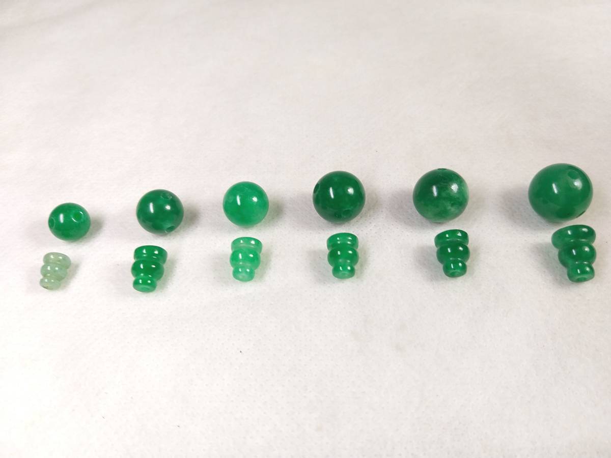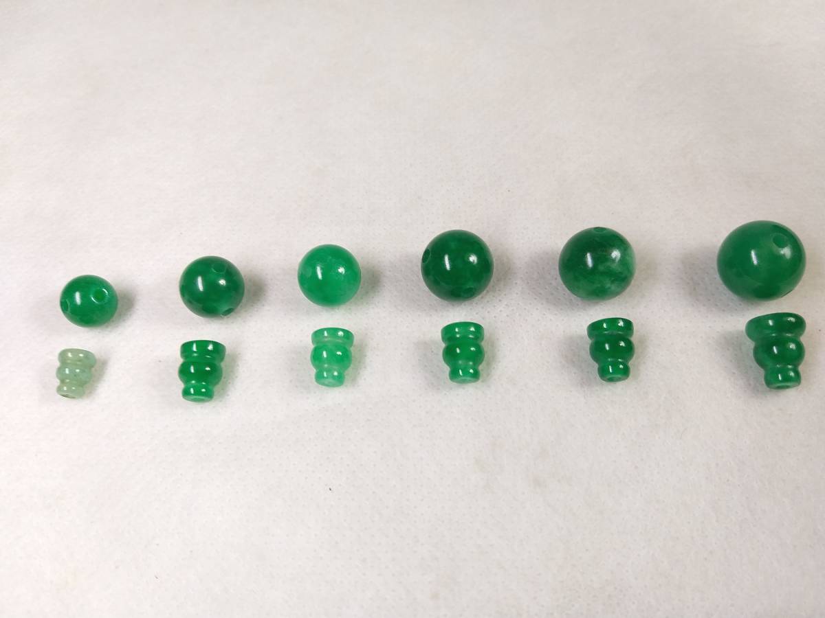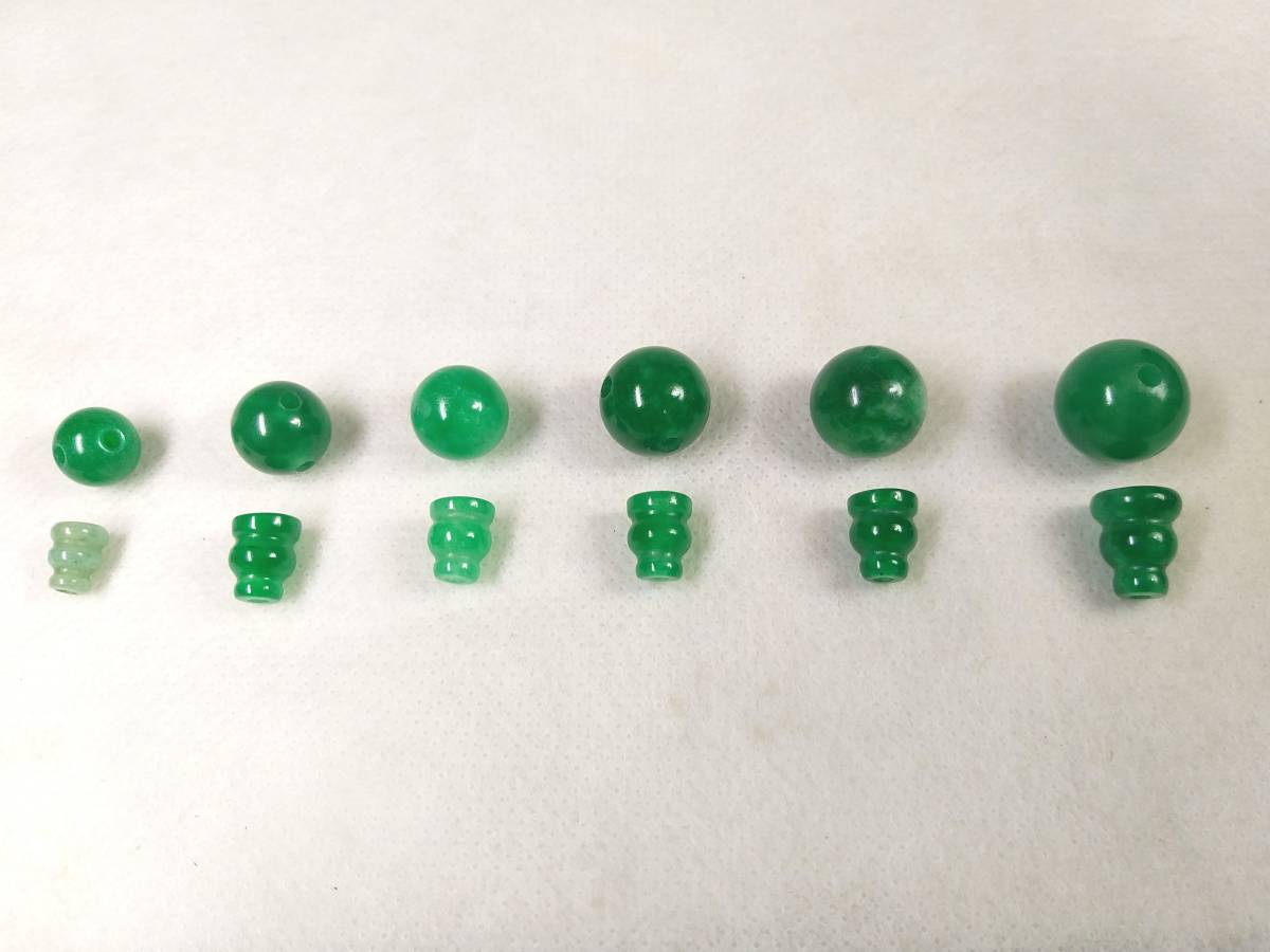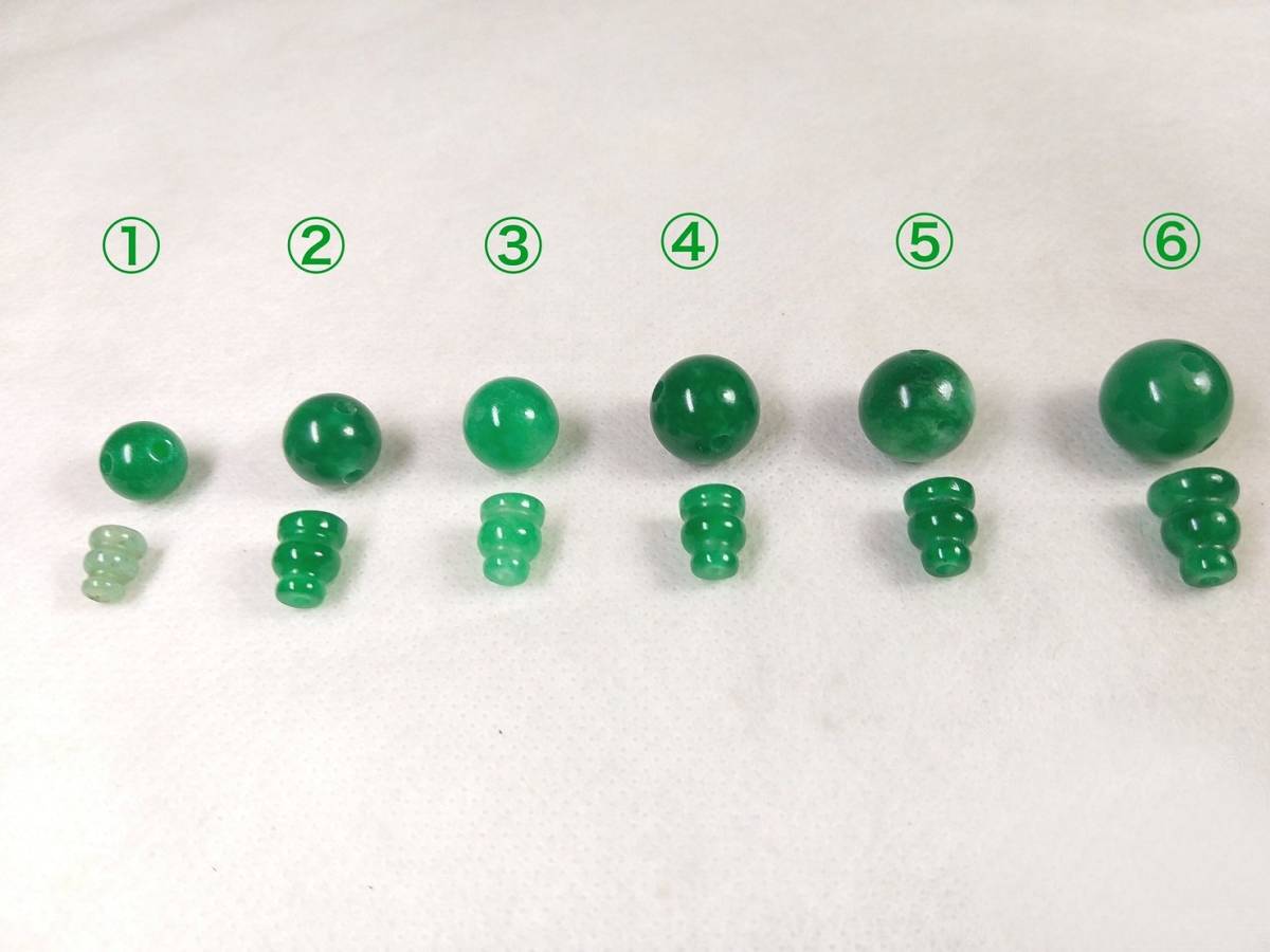 1枚目の写真をご覧下さい。 左から右に順番に並んでいるのは、手元にある直径①10.3mm②12mm③13mm④14mm⑤14.5mm⑥15mmの6種類の最高AAA級極品ミャンマー翠玉数珠、腕輪念珠用親玉ボサです。それぞれ別途出品中ですので、ご希望のサイズをご確認の上、ご入札下さい。