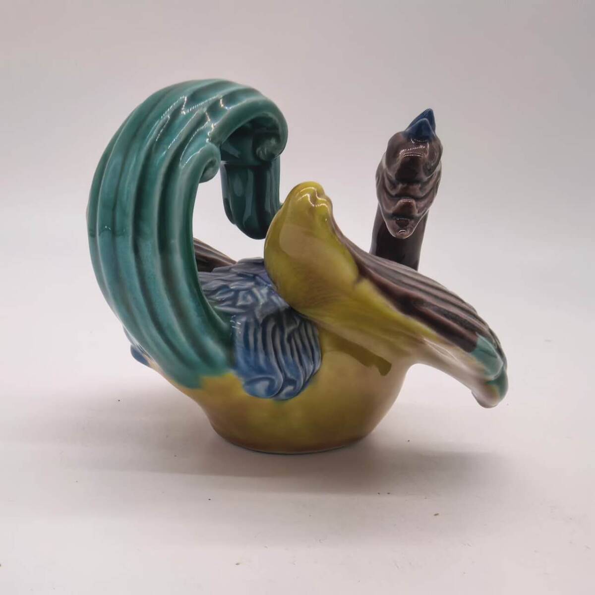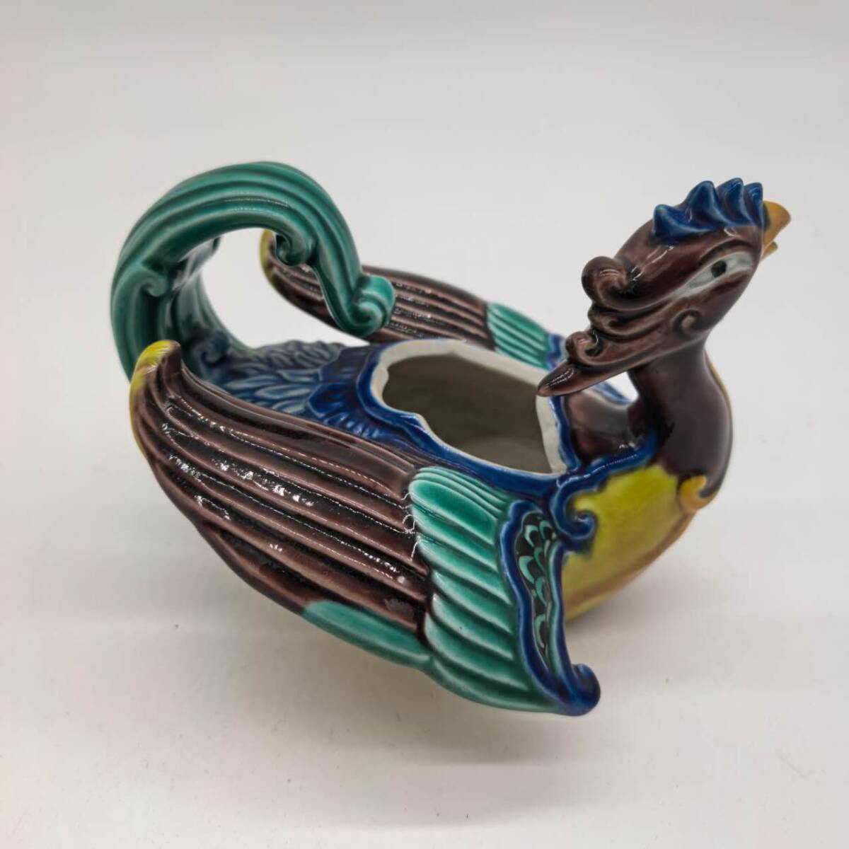 ・ブランド:九谷焼 木田弘之作 色釉 瑞鳥香炉 置物 香道具 ・商品紹介:香炉以瑞(凰)造型,色彩,羽翼与尾部装精美,寓意吉祥。 ・サイズ:高さ:10.5cm、幅:13cm、重量:470g,※素人採寸につき、多少の誤差はご容赦ください。 ・状態:ヒビや欠けはございます。(実物写真をご参照ください)。香炉の蓋に破損がございます,写真に写っているものが全てです。 |