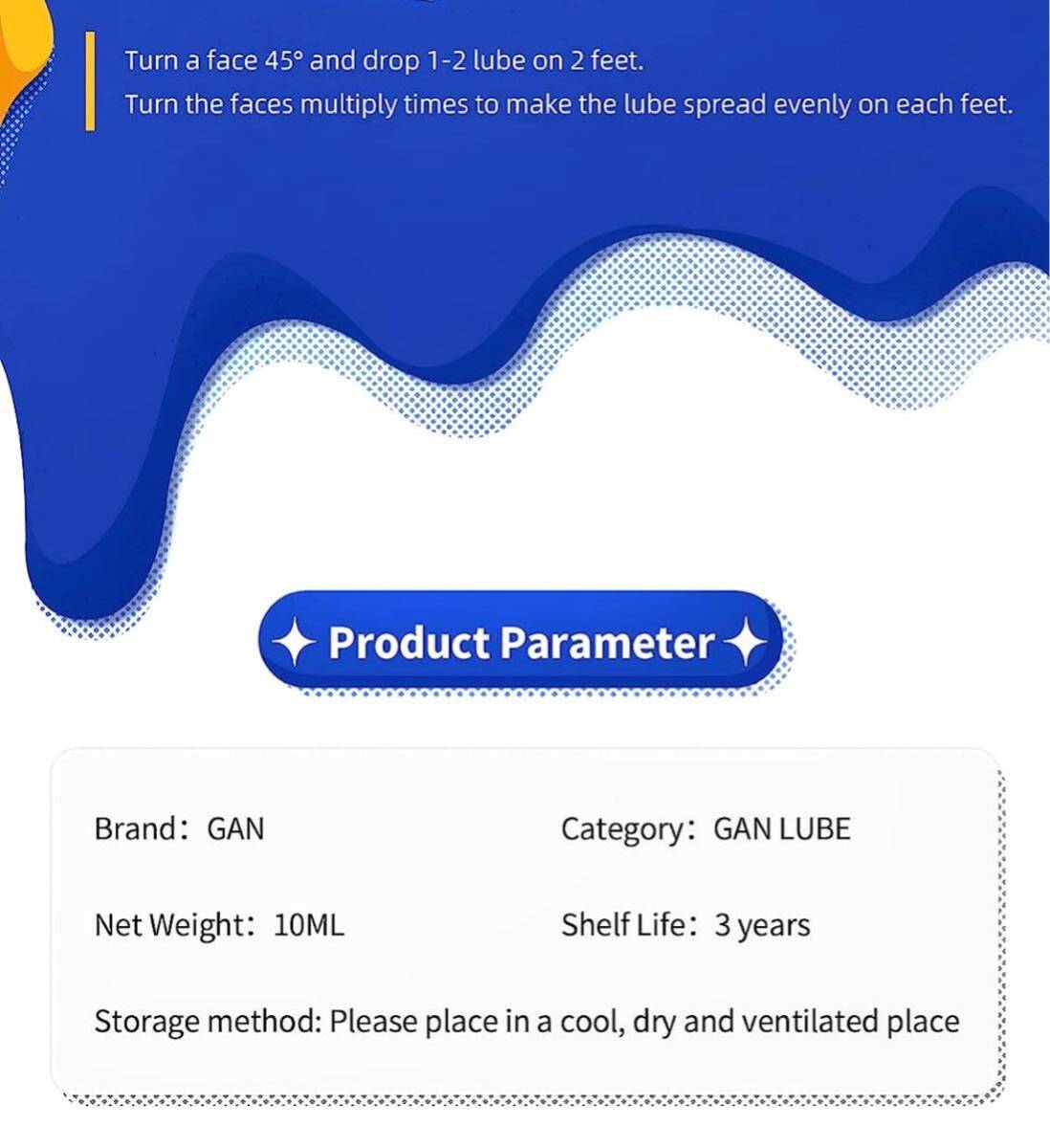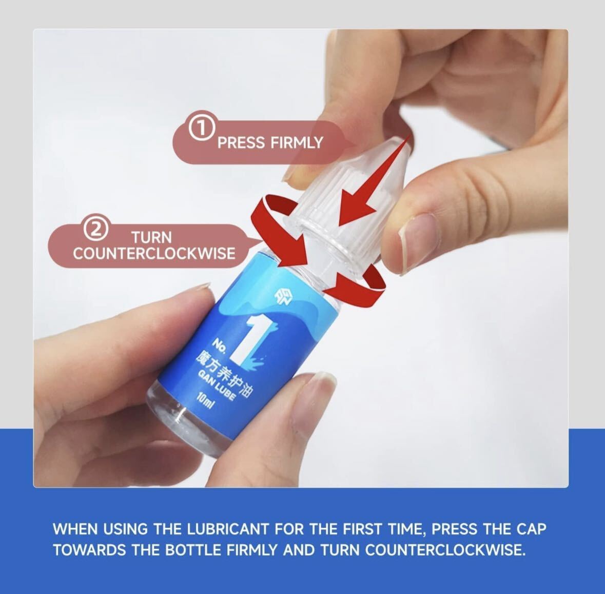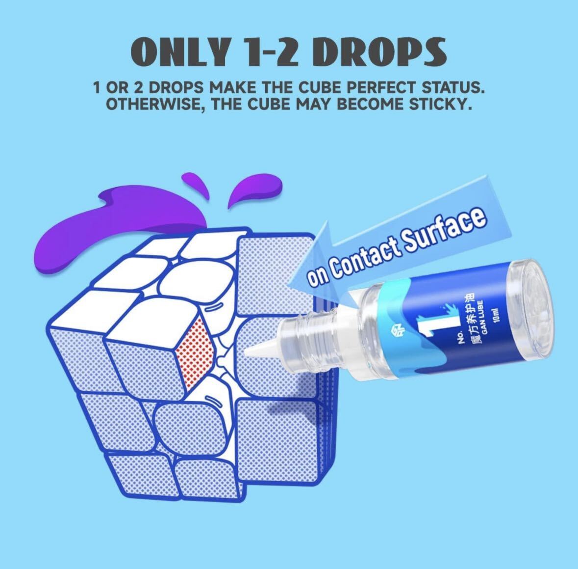 【注意事項】日常の使用では、キューブが乾燥する前に注油してください。 潤滑剤が不十分な場合、手触りが悪くなったり、抵抗が出たりするだけでなく、破損の原因にもなる可能性があるので注意してください。 異なる種類の潤滑剤を混ぜないで下さい。 GAN純正の潤滑剤はキューブに最適です。 他の潤滑剤を使用することもできますが、その際はキューブを完全に洗浄してから他の種類の潤滑剤を塗布してください。