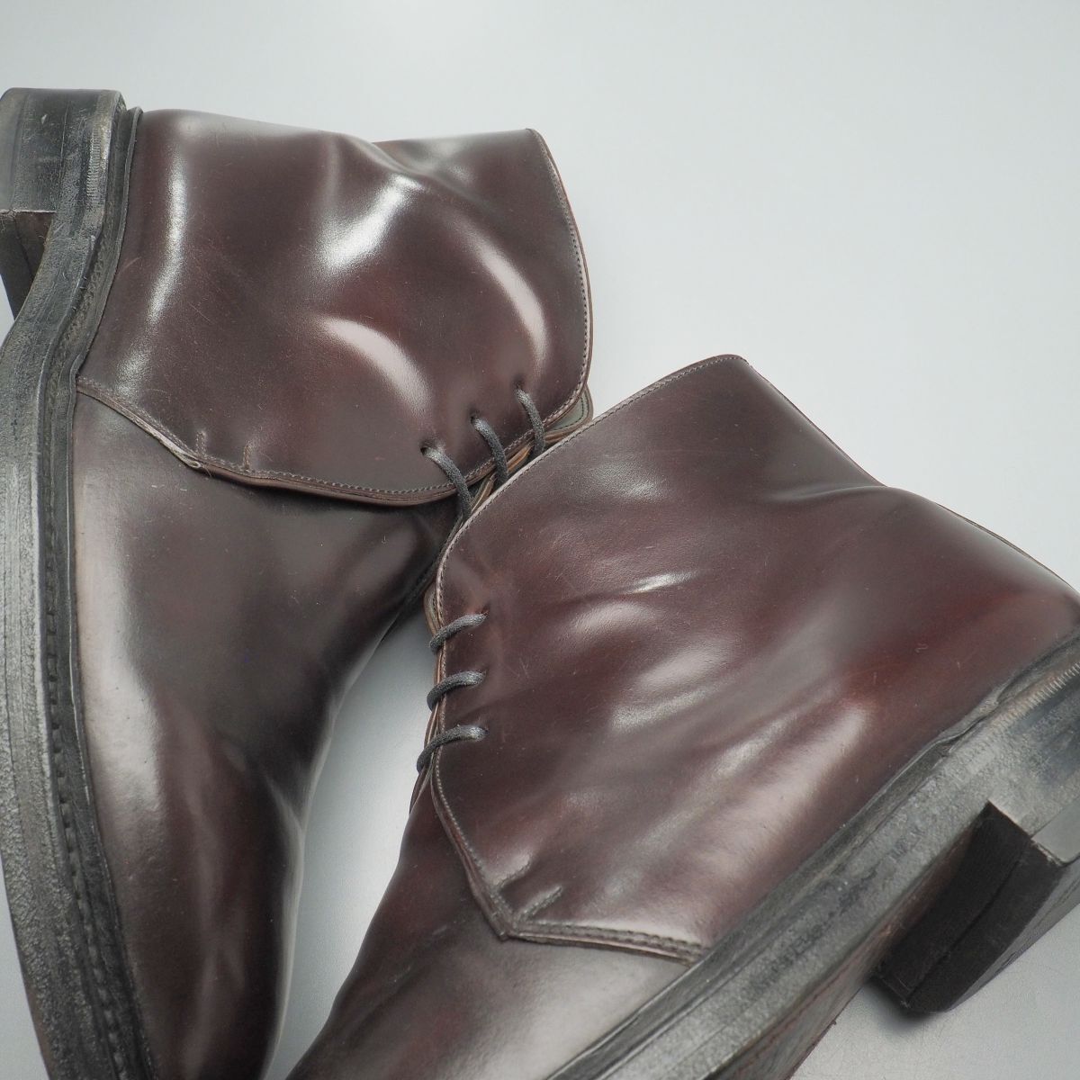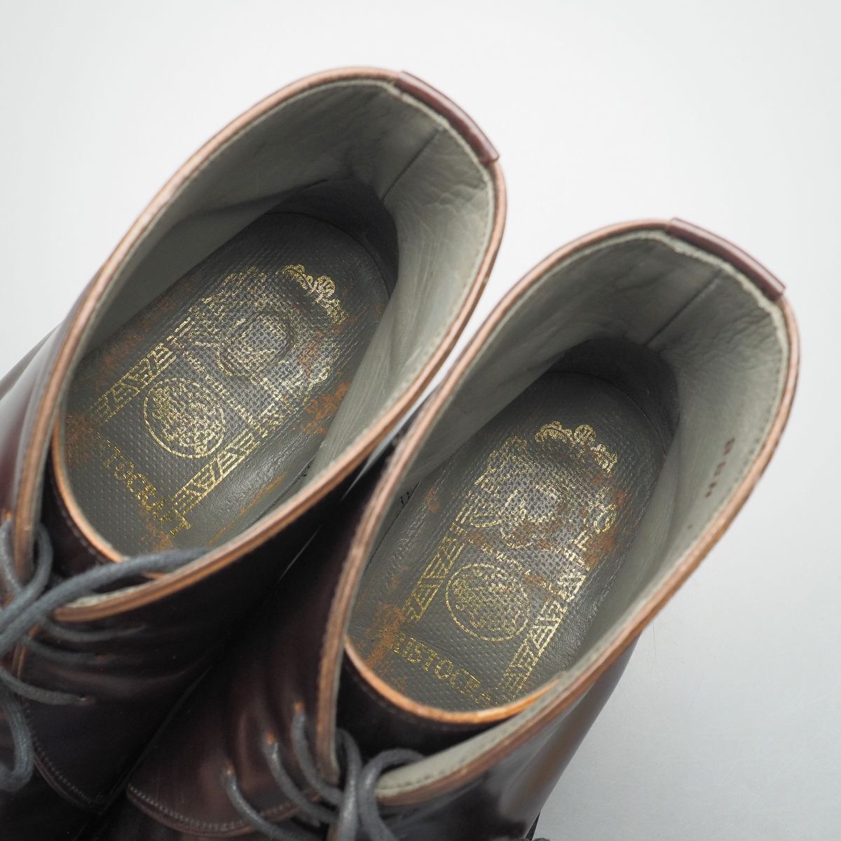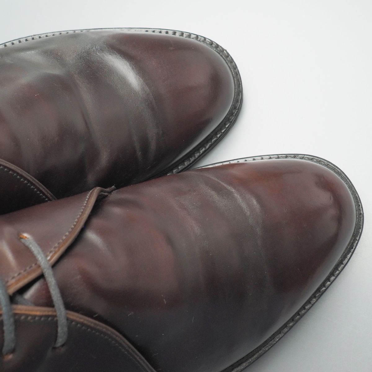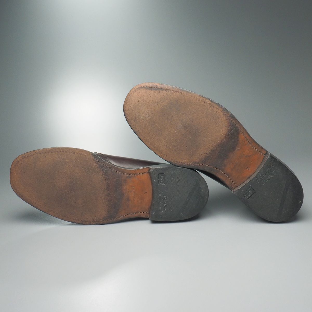 【コンディション詳細】 アッパーのシワ、所々の擦れキズや色ムラ、薄汚れ、またインソールやライニングの擦れがございますが、その他支障になるようなダメージ等はなくこれからも十分にご愛用いただけるコンディションです。 アウトソールの減りはトゥ・ヒール共に5mm程度、トゥ部分に関しましては減りがミッドソール部分に達しておりますので、ご落札後に半張りなどの補強・補修をお勧めいたします。 |