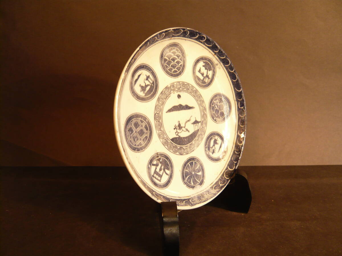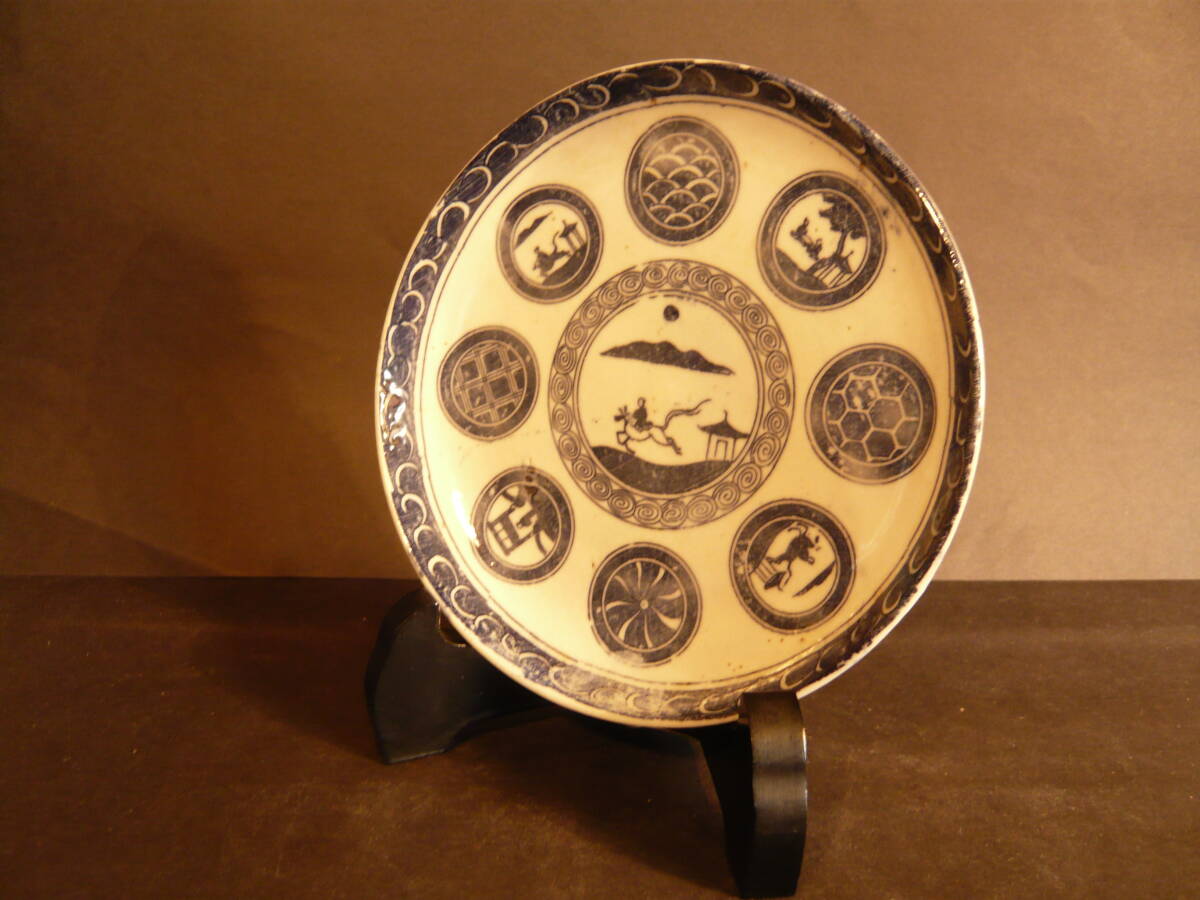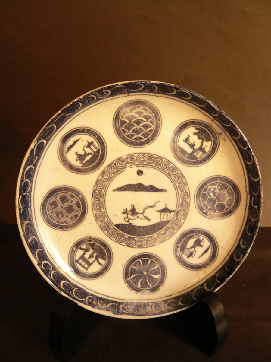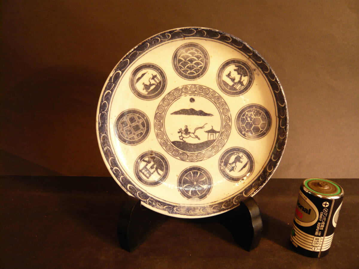 印判染付の丸文中皿です、傷はありません。大きさは、直径約15.6センチ、高さ約2.5センチ、高台径約8.8センチです。