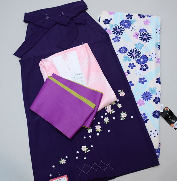 項目 | 着物袴フルセット (適合身長:約135cm~143cm、約144cm~150cm ジュニア用へお仕立て直し致します。) ・二尺袖着物 ・二尺袖長襦袢(半襟付き) ・袴(紫色) ・袴下帯(浴衣帯にも使用できます。) |