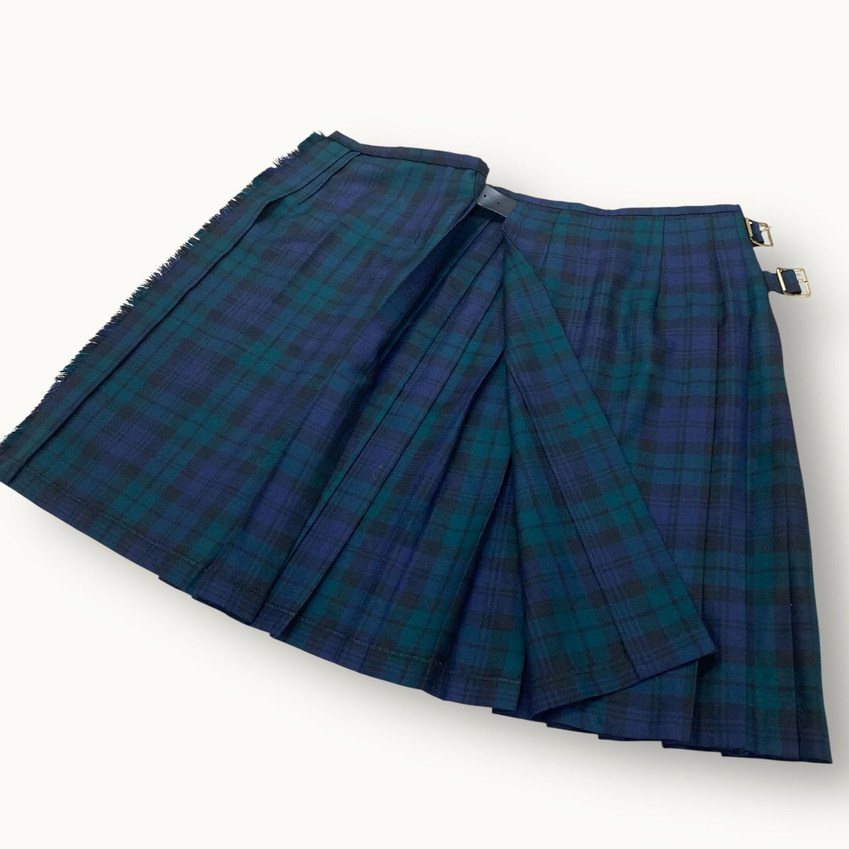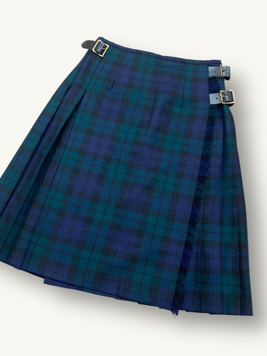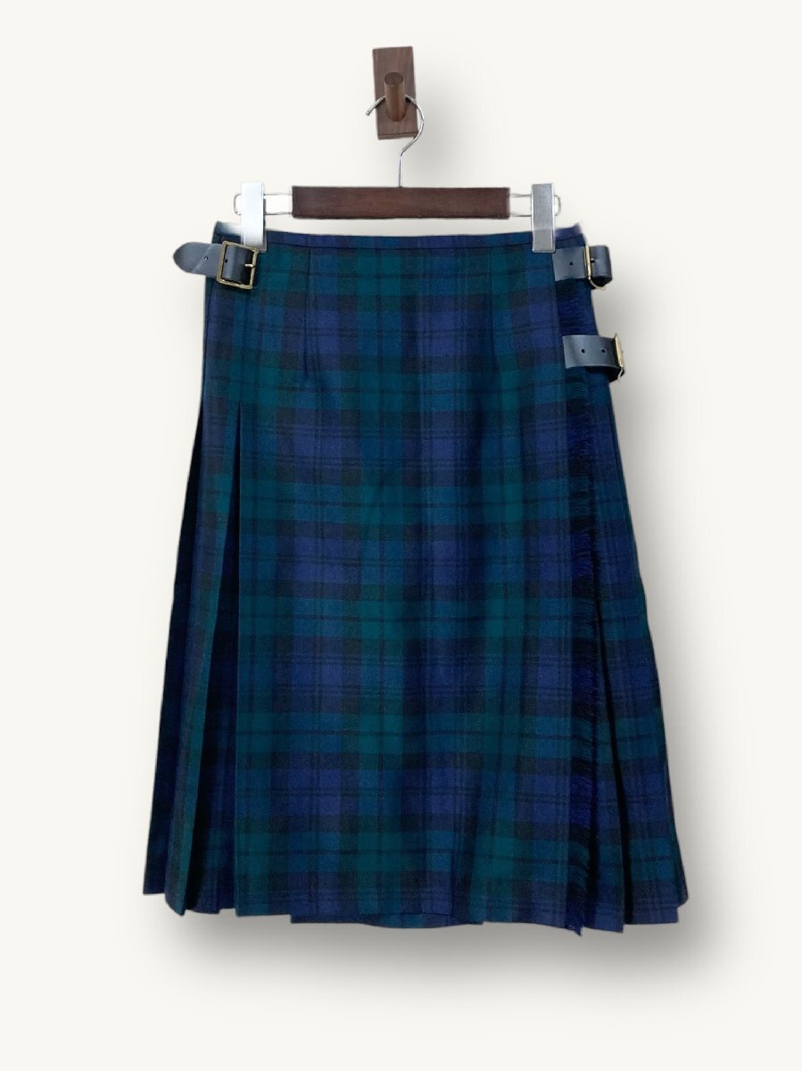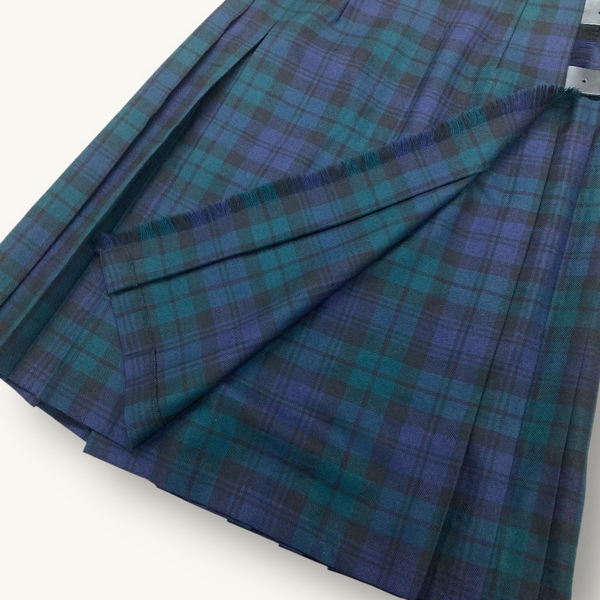 スコットランドの伝統的なキルトスカートのデザインで、ウエスト左右のベルトで着脱とサイズの調節が可能な仕様です。