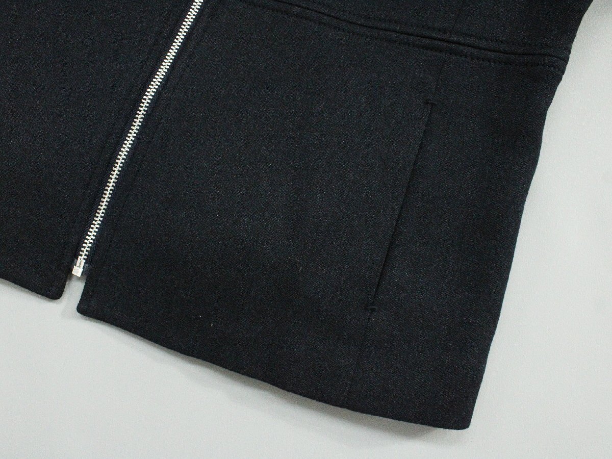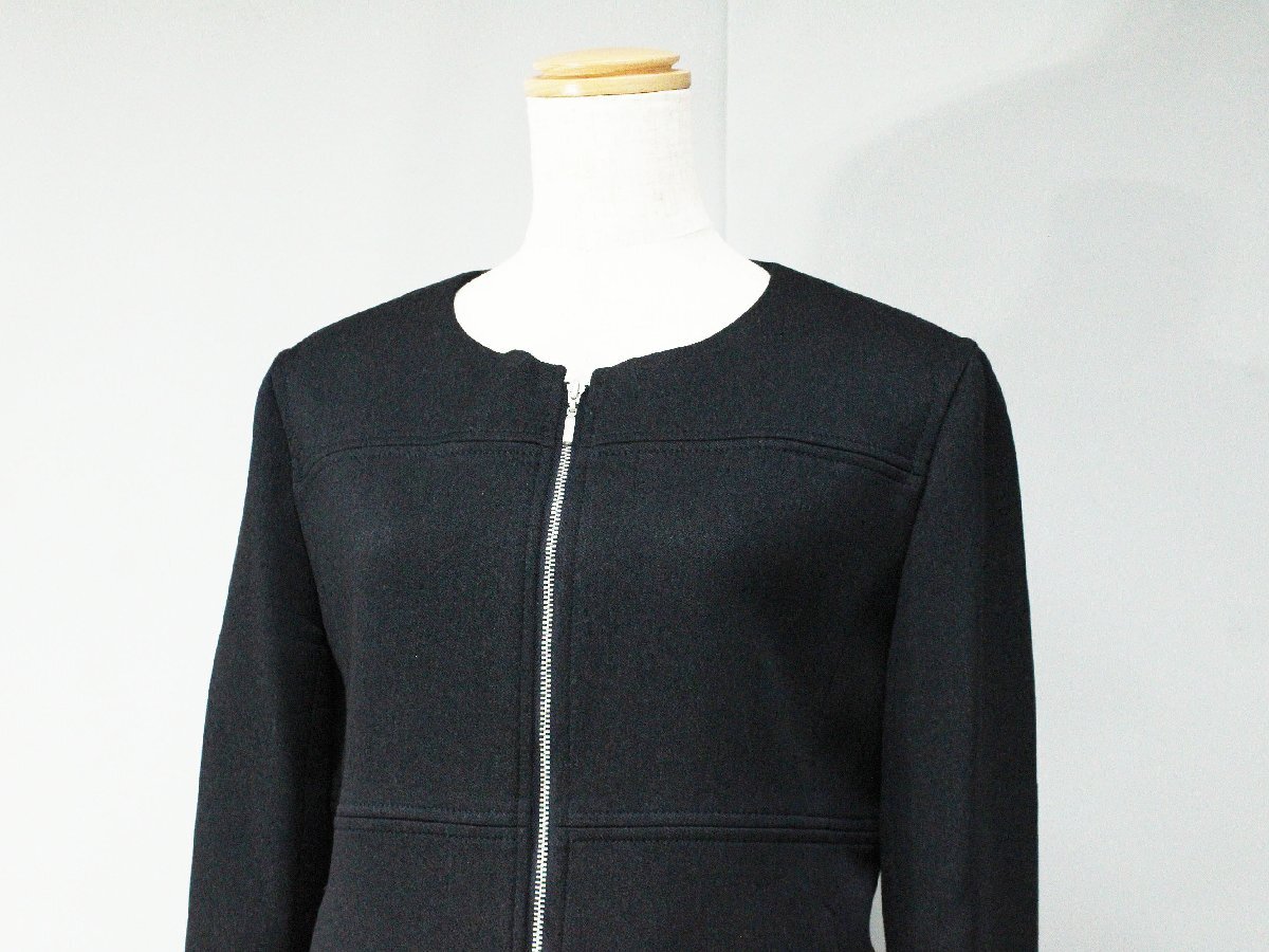 すっきりとしたノーカラーは、タートルニットなど襟元にボリュームのあるインナーなども合わせやすいのがポイントです。