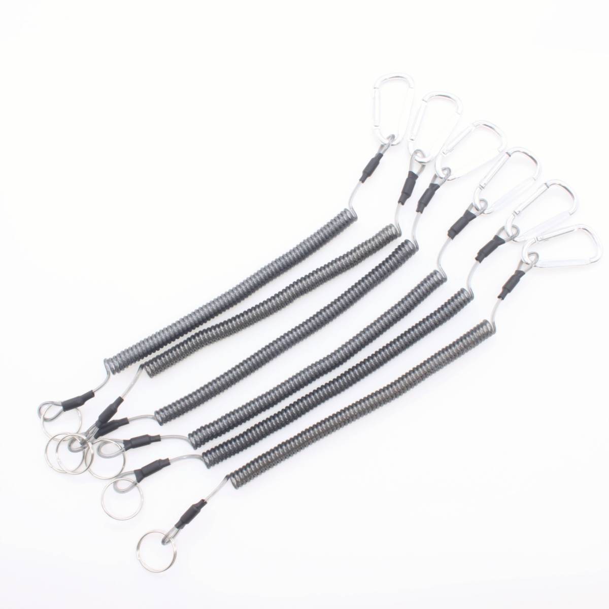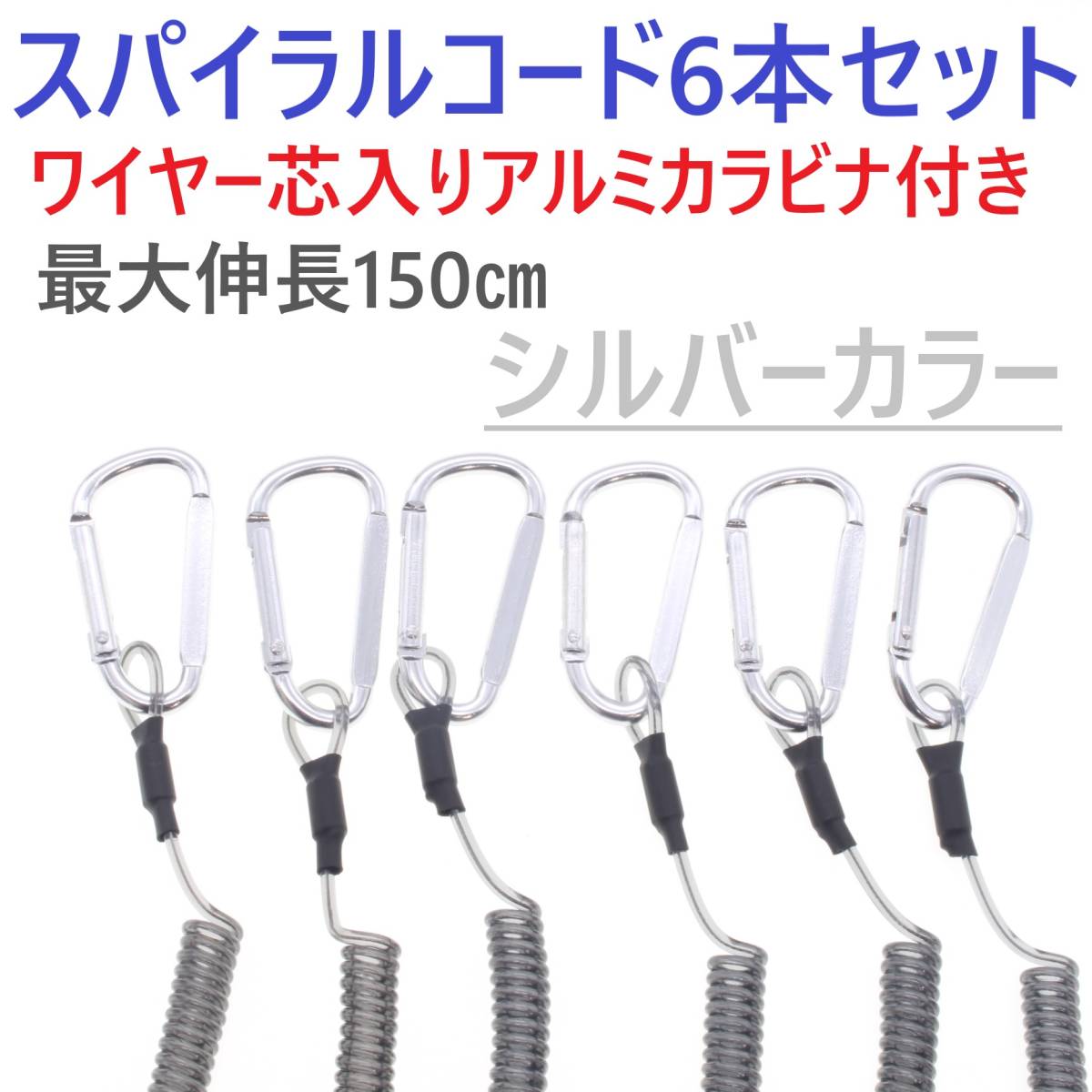 【送料無料】カールコード シルバー 6本セット スパイラルコード ワイヤー芯入り アルミカラビナ付き 釣り道具 工具 落下防止に 尻手ロープ の出品です。