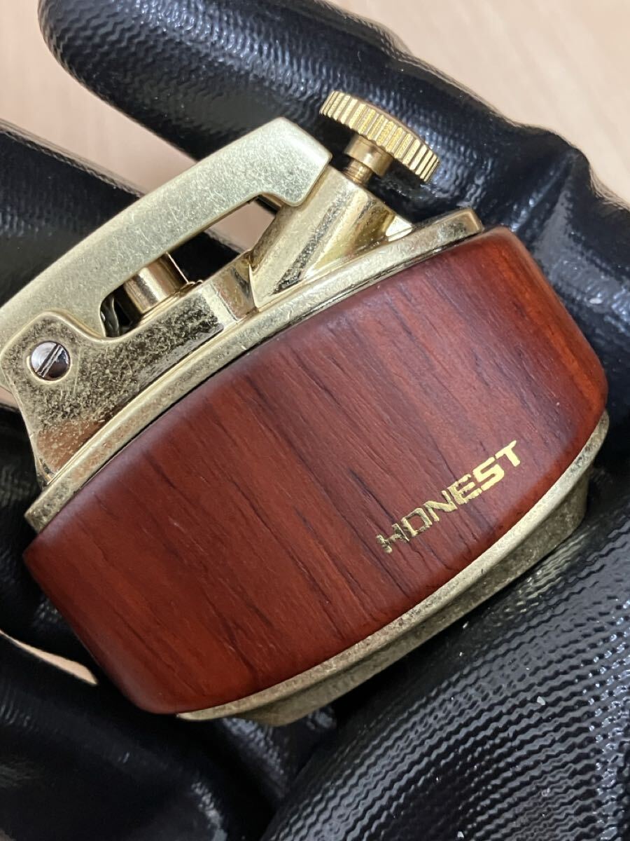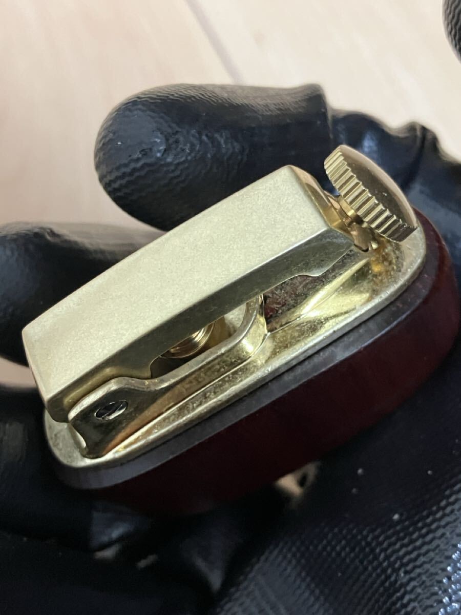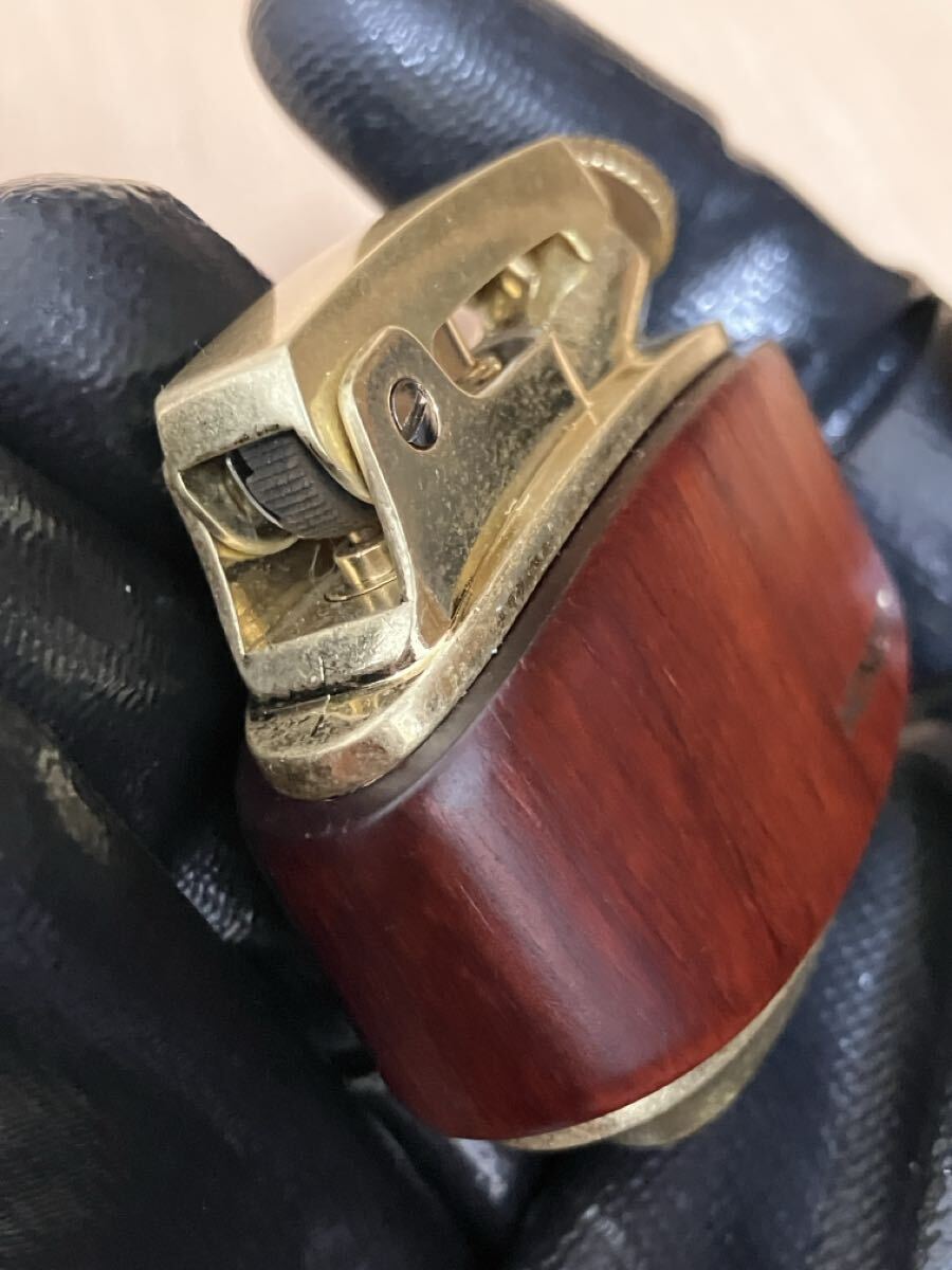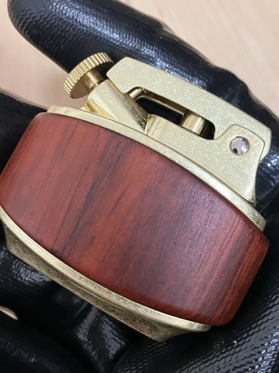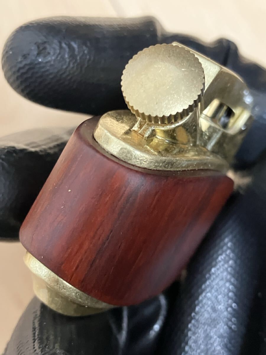 ライターの胴の部分は木製、着火部と底の部分には金属製です