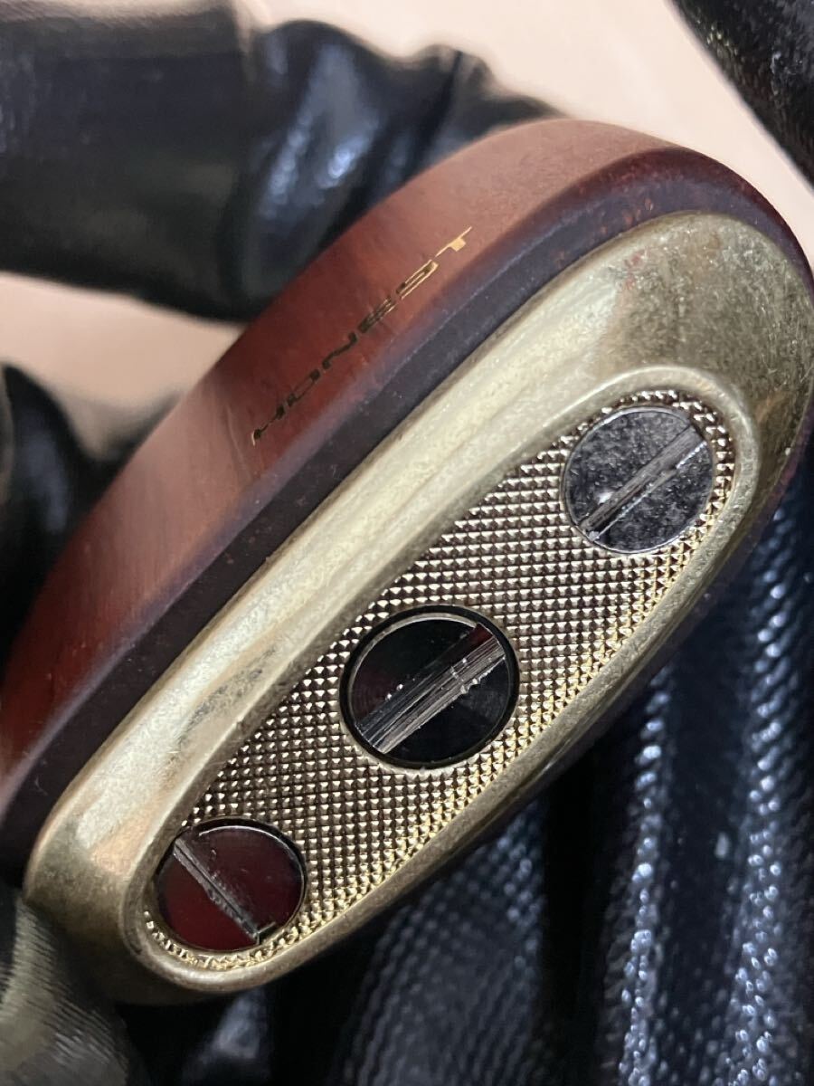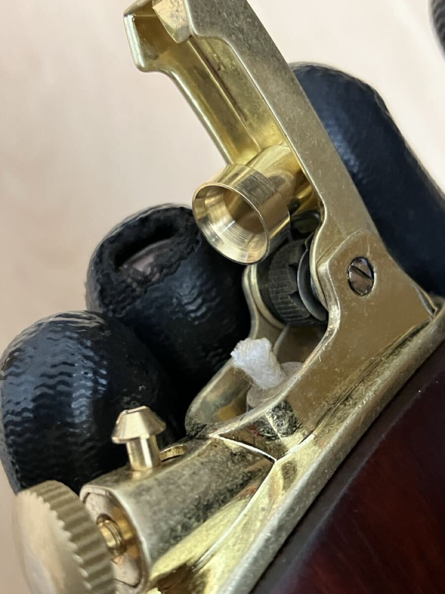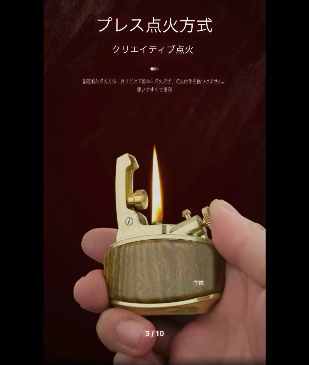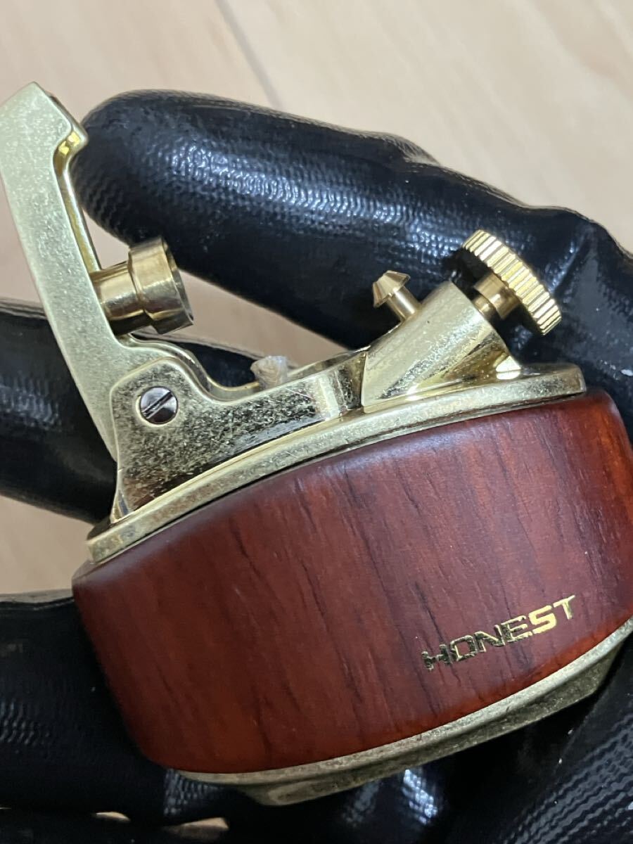 ライターの胴の部分は木製、着火部と底の部分には金属製です