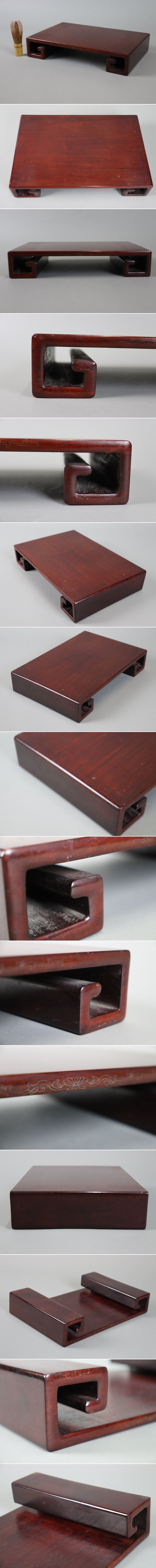 時代 唐木 象嵌細工 角型 巻足花台 幅33,5cm 紫檀花梨 香炉台 飾台 細密細工 古美術品[d1058]