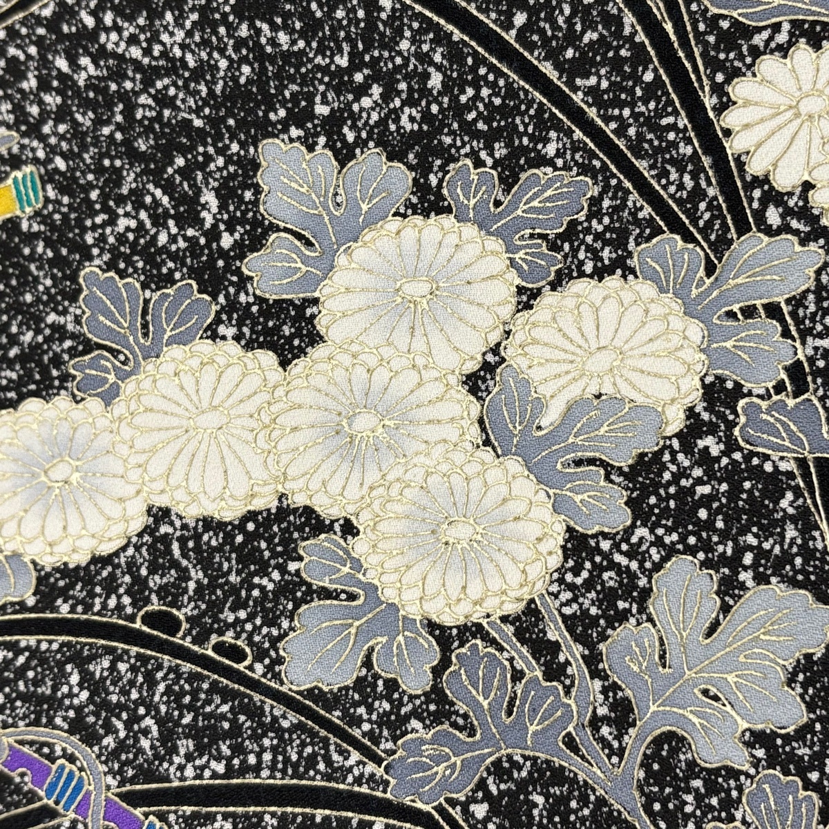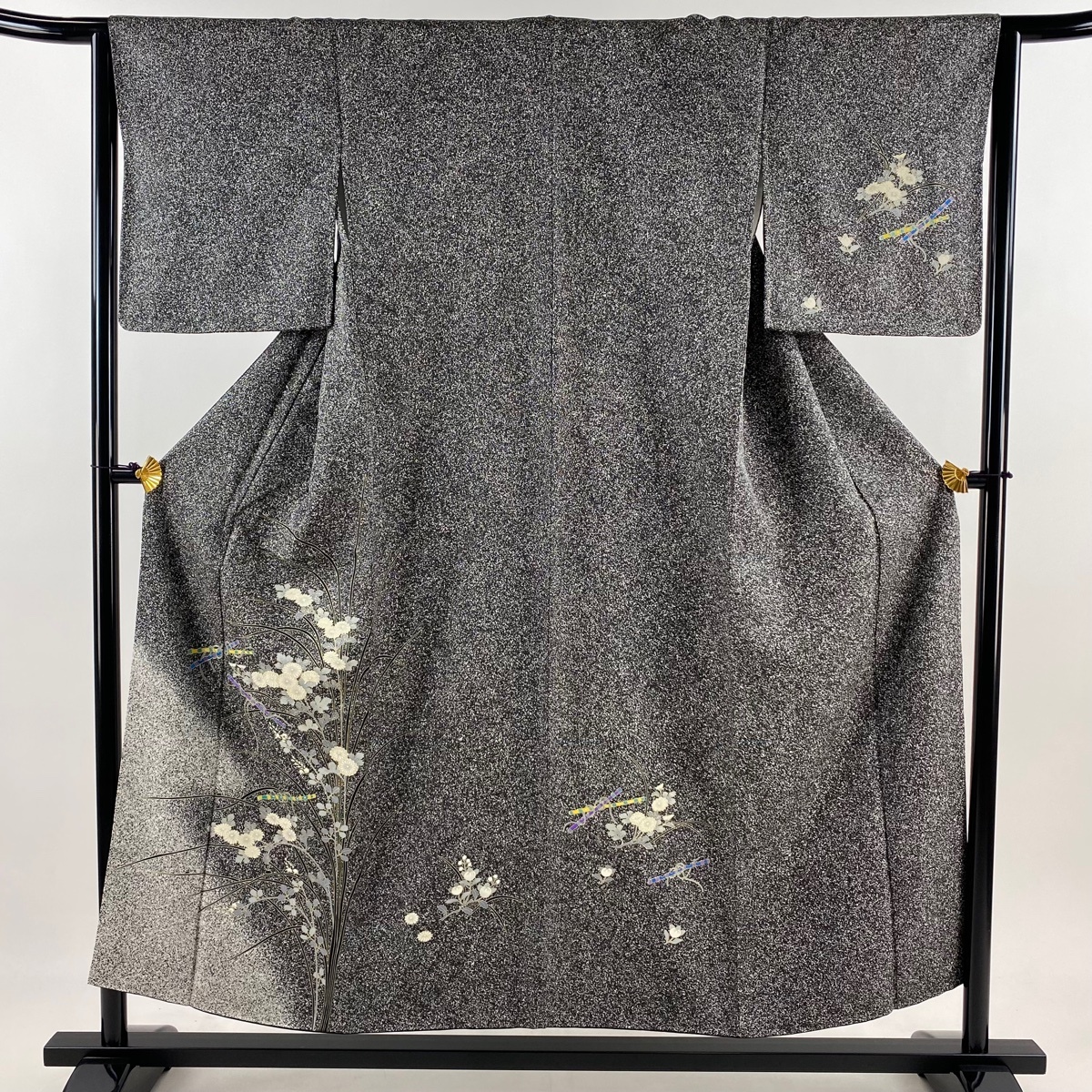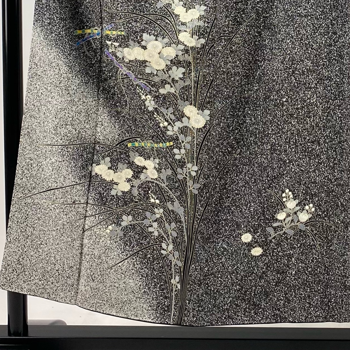 | 付下げ 秀品 菊 笛 金彩 ぼかし 黒灰 袷 身丈153 裄丈64.5 M 正絹 【中古】 |