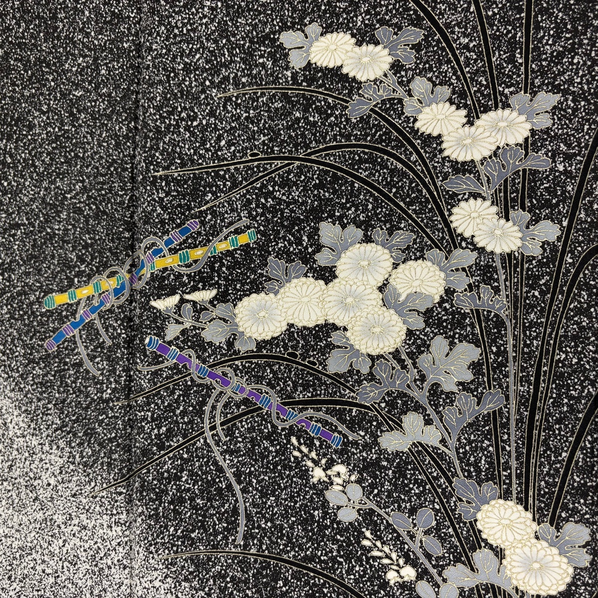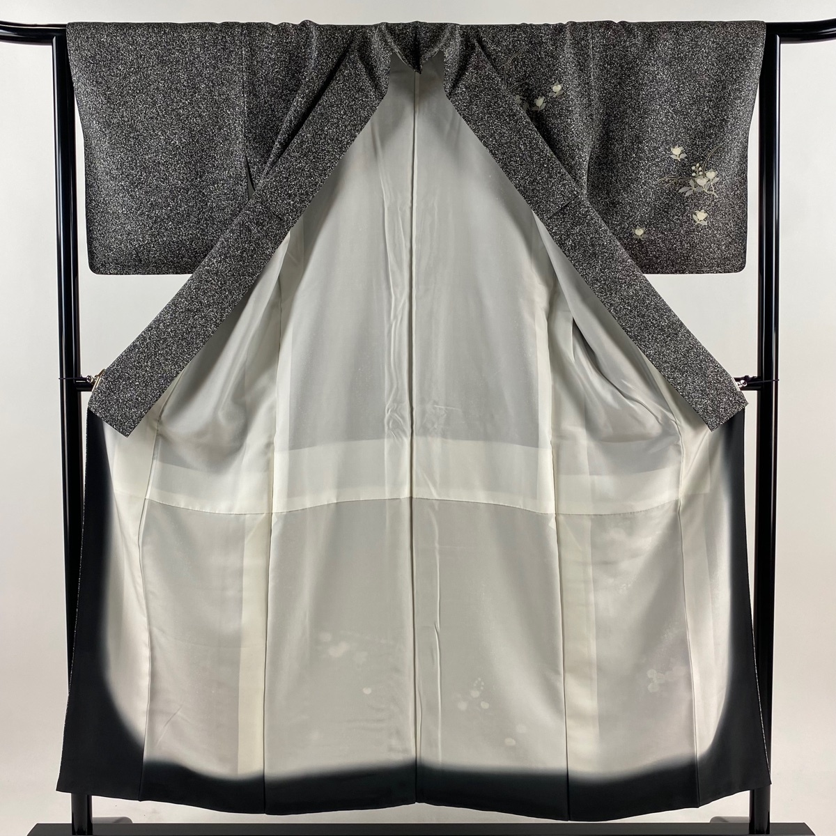 | 付下げ 秀品 菊 笛 金彩 ぼかし 黒灰 袷 身丈153 裄丈64.5 M 正絹 【中古】 |